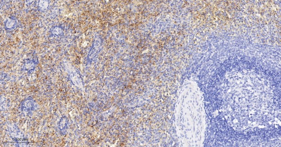 Paraformaldehyde-fixed, paraffin embedded Rat Spleen; Antigen retrieval by boiling in sodium citrate buffer (pH6.0) for 15 min; The section was incubated with CXCL4 Monoclonal Antibody, Unconjugated (bsm-61577R) at 1:200 overnight at 4°C, followed by conjugation to the bs-0295G-HRP and DAB (C-0010) staining.