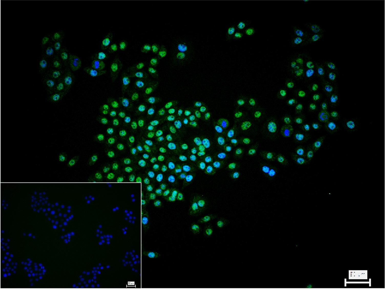 4% Paraformaldehyde-fixed MCF-7 (H) cell; Triton X-100 at r.t. for 20 min; Antibody incubation with (SIN3A) monoclonal Antibody, unconjugated (bsm-61578R) 1:100, 90 min at 37°C; followed by conjugated Goat Anti-Rabbit IgG antibody (green, bs-40295G-FITC) at 37°C for 90 min, DAPI (blue, C02-04002) was used to stain the cell nuclei. PBS instead of the primary antibody was used as the blank control.