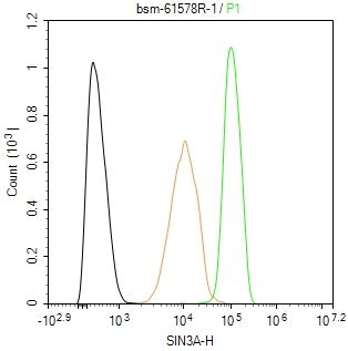 The MCF-7 (H) cells were fixed with 4% PFA (10 min at r.t.) and then permeabilized with 90% ice-cold methanol for 20 min at -20℃,the cells then were incubated in 5%BSA to block non-specific protein-protein interactions (30 min at r.t.), followed by secondary antibody incubation for 40 min at room temperature. Primary Antibody (green):Rabbit Anti-SIN3A antibody (bsm-61578R,1:100); Isotype Control (orange): Rabbit IgG (bs-0295P). Blank control (black): PBS. Acquisition of 20,000 events was performed.