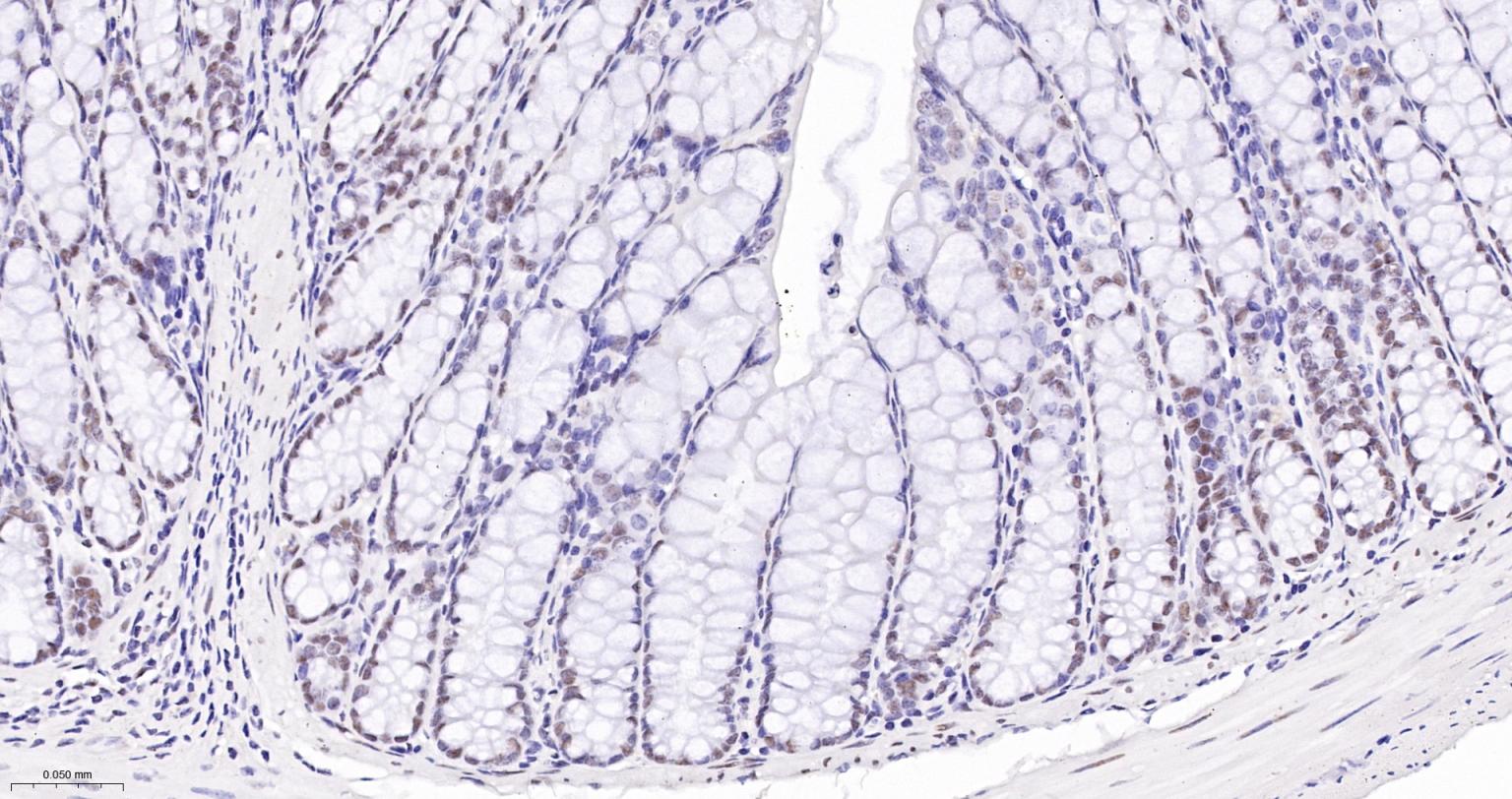 Paraformaldehyde-fixed, paraffin embedded Mouse Colon; Antigen retrieval by boiling in sodium citrate buffer (pH6.0) for 15 min; The section was incubated with SIN3A Monoclonal Antibody, Unconjugated (bsm-61578R) at 1:200 overnight at 4°C, followed by conjugation to the bs-0295G-HRP and DAB (C-0010) staining.