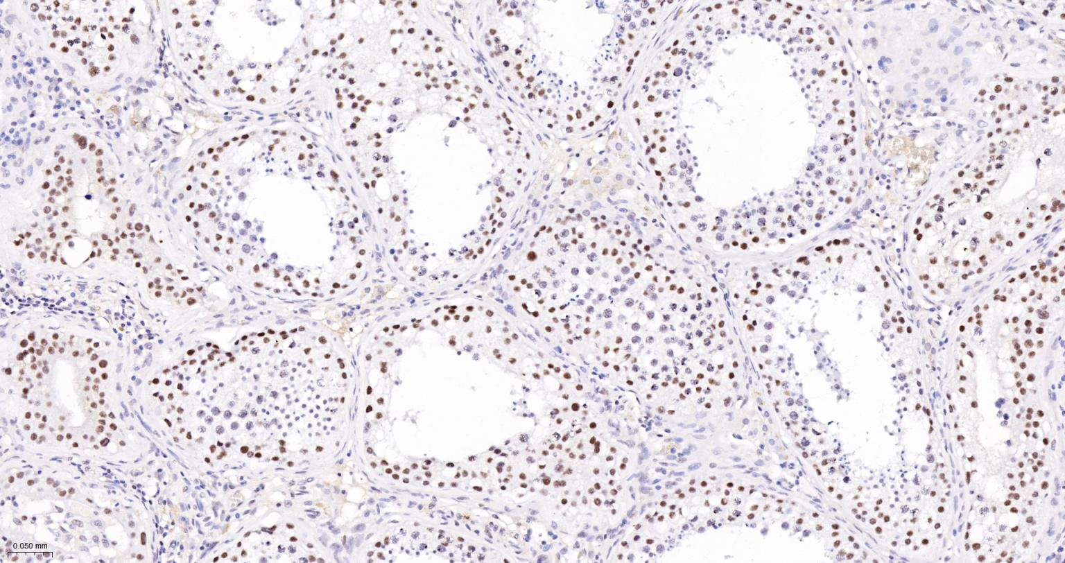 Paraformaldehyde-fixed, paraffin embedded Human Testicles; Antigen retrieval by boiling in sodium citrate buffer (pH6.0) for 15 min; The section was incubated with SIN3A Monoclonal Antibody, Unconjugated (bsm-61578R) at 1:200 overnight at 4°C, followed by conjugation to the bs-0295G-HRP and DAB (C-0010) staining.