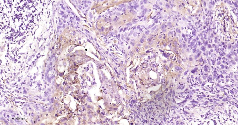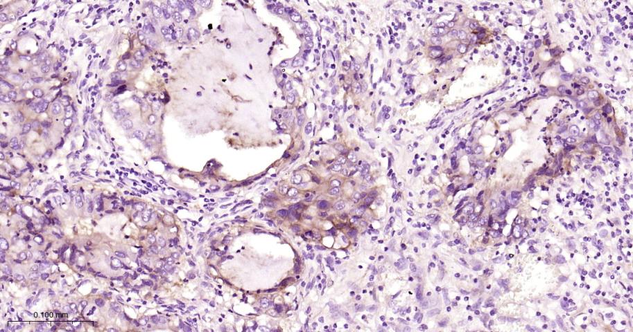 Paraformaldehyde-fixed, paraffin embedded Human Lung Cancer; Antigen retrieval by boiling in sodium citrate buffer (pH6.0) for 15 min; Antibody incubation with CD55 Monoclonal Antibody, Unconjugated(bsm-61587R) at 1:200 overnight at 4°C, followed by conjugation to the bs-0295G-HRP and DAB (C-0010) staining.