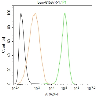 The Jurkat (H) cells were fixed with 4% PFA (10 min at r.t.) and then permeabilized with 90% ice-cold methanol for 20 min at -20℃,the cells then were incubated in 5%BSA to block non-specific protein-protein interactions (30 min at r.t.), followed by secondary antibody incubation for 40 min at room temperature. Primary Antibody (green):Rabbit Anti-ARA24 antibody (bsm-61597R,1:100); Isotype Control (orange): Rabbit IgG (bs-0295P). Blank control (black): PBS. Acquisition of 20,000 events was performed.