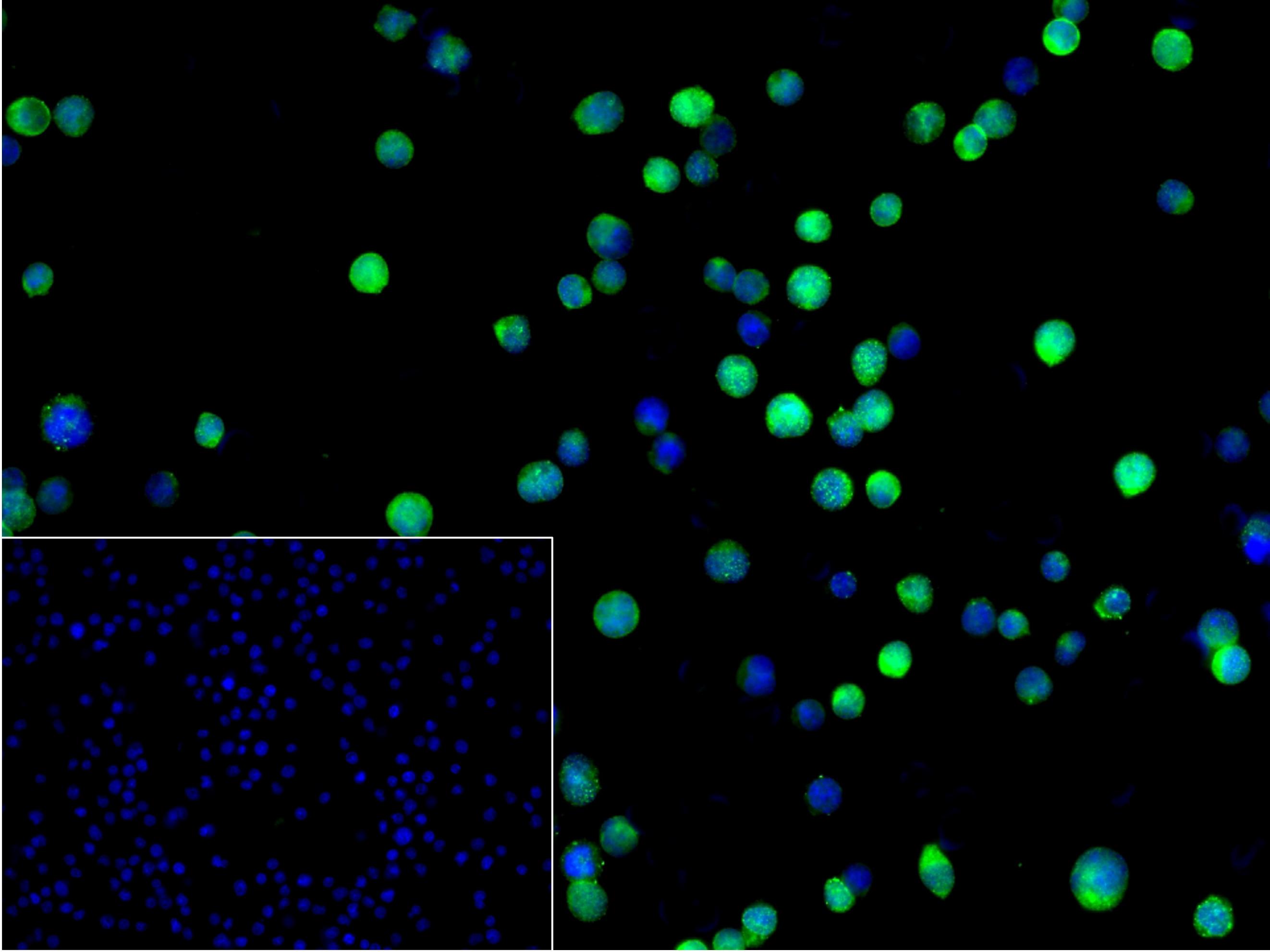 4% Paraformaldehyde-fixed Jurkat (H) cell; Triton X-100 at r.t. for 20 min; Antibody incubation with (ARA24) monoclonal Antibody, unconjugated (bsm-61597R) 1:100, 90 min at 37°C; followed by conjugated Goat Anti-Rabbit IgG antibody (green, bs-60295G-BF488) at 37°C for 90 min, DAPI (blue, C02-04002) was used to stain the cell nuclei. PBS instead of the primary antibody was used as the blank control.