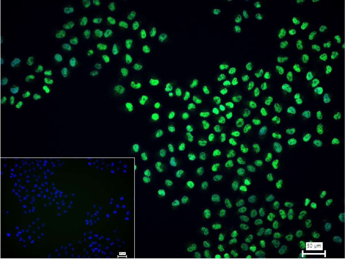 4% Paraformaldehyde-fixed Hela (H) cell; Triton X-100 at r.t. for 20 min; Antibody incubation with (HP1 gamma) monoclonal Antibody, unconjugated (bsm-61603R) 1:100, 90 min at 37°C; followed by conjugated Goat Anti-Rabbit IgG antibody (green, bs-40295G-FITC) at 37°C for 90 min, DAPI (blue, C02-04002) was used to stain the cell nuclei. PBS instead of the primary antibody was used as the blank control.