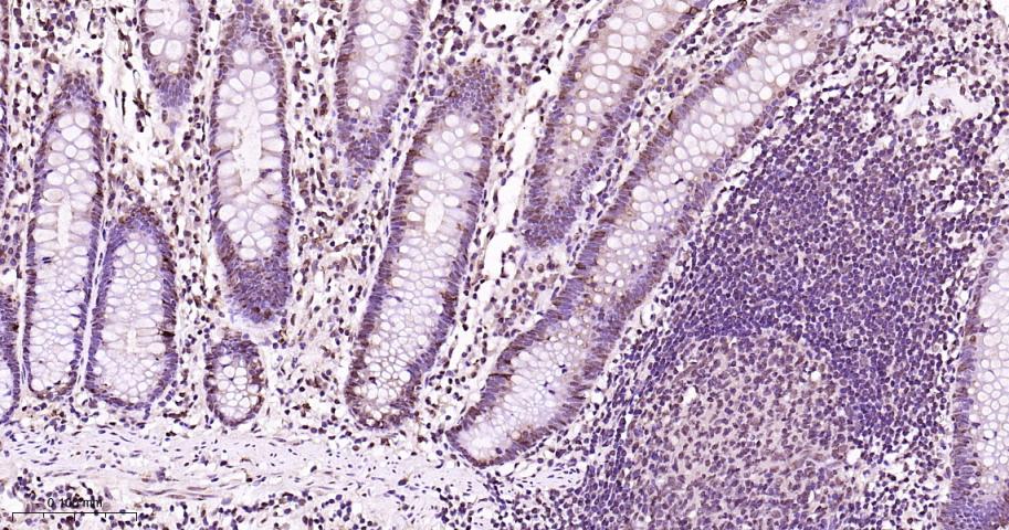 Paraformaldehyde-fixed, paraffin embedded Human colon; Antigen retrieval by boiling in sodium citrate buffer (pH6.0) for 15 min; The section was incubated with HP1 gamma Monoclonal Antibody, Unconjugated(bsm-61603R) at 1:200 overnight at 4°C, followed by conjugation to the bs-0295G-HRP and DAB (C-0010) staining.