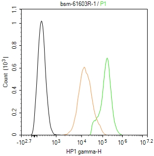 The Hela (H) cells were fixed with 4% PFA (10 min at r.t.) and then permeabilized with 90% ice-cold methanol for 20 min at -20℃,the cells then were incubated in 5%BSA to block non-specific protein-protein interactions (30 min at r.t.), followed by secondary antibody incubation for 40 min at room temperature.Primary Antibody (green):Rabbit Anti-HP1 gamma antibody (bsm-61603R,1:100); Isotype Control (orange): Rabbit IgG (bs-0295P). Blank control (black): PBS. Acquisition of 20,000 events was performed.