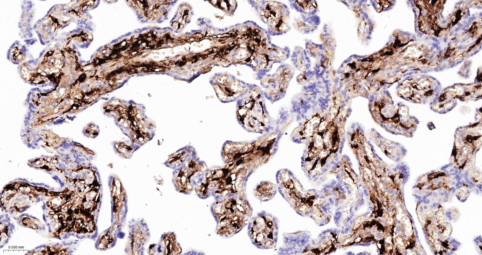 Paraformaldehyde-fixed, paraffin embedded Human Placenta; Antigen retrieval by boiling in sodium citrate buffer (pH6.0) for 15 min; The section was incubated with Coagulation factor XIII A Monoclonal Antibody, Unconjugated (bsm-61604R) at 1:200 overnight at 4°C, followed by conjugation to the bs-0295G-HRP and DAB (C-0010) staining.