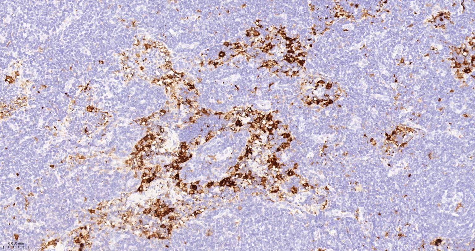 Paraformaldehyde-fixed, paraffin embedded Human Lymph; Antigen retrieval by boiling in sodium citrate buffer (pH6.0) for 15 min; The section was incubated with Coagulation factor XIII A Monoclonal Antibody, Unconjugated (bsm-61604R) at 1:200 overnight at 4°C, followed by conjugation to the bs-0295G-HRP and DAB (C-0010) staining.