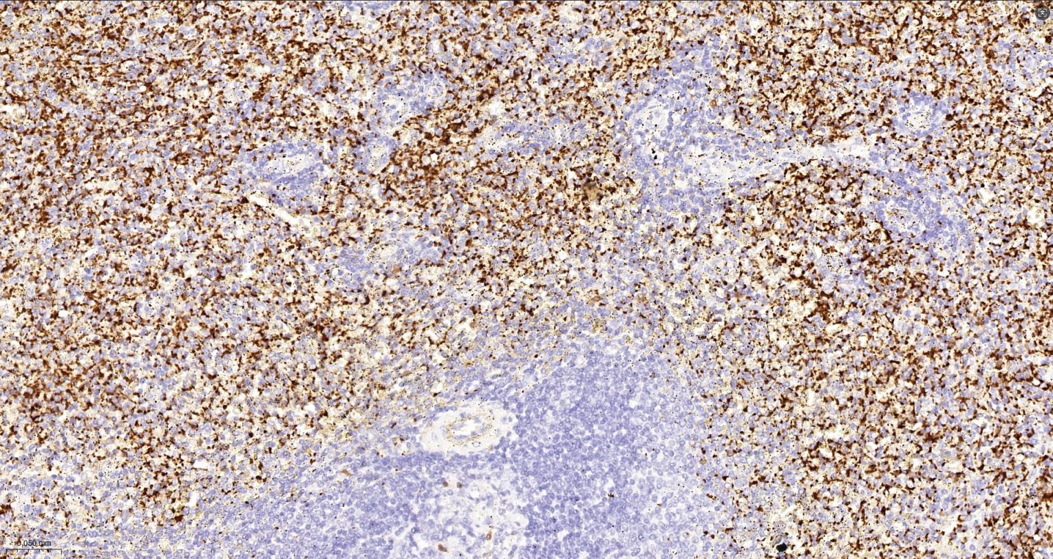 Paraformaldehyde-fixed, paraffin embedded Human Spleen; Antigen retrieval by boiling in sodium citrate buffer (pH6.0) for 15 min; The section was incubated with Coagulation factor XIII A Monoclonal Antibody, Unconjugated (bsm-61604R) at 1:200 overnight at 4°C, followed by conjugation to the bs-0295G-HRP and DAB (C-0010) staining.