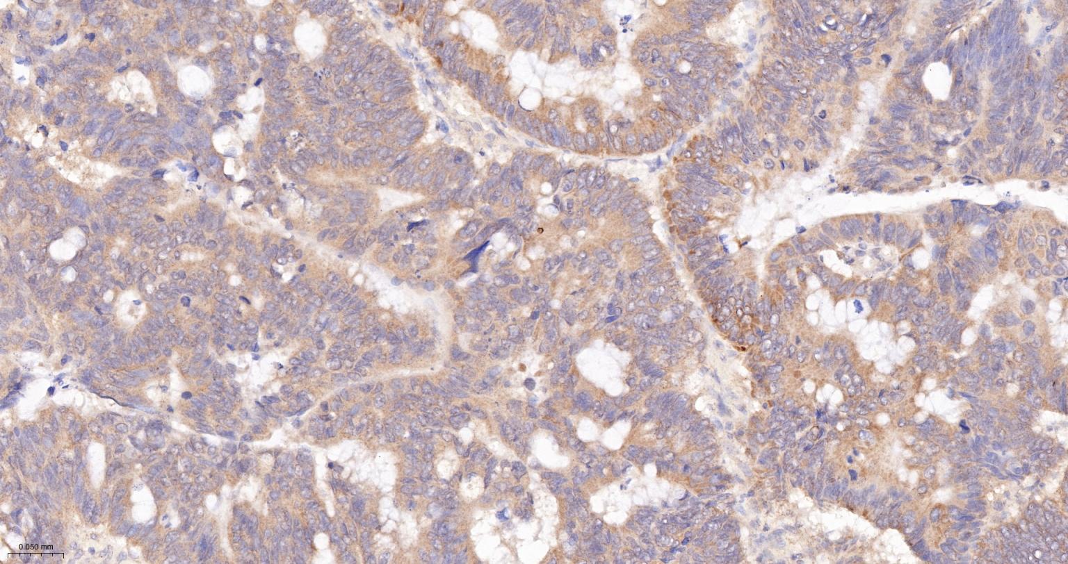 Paraformaldehyde-fixed, paraffin embedded Human Colon Cancer; Antigen retrieval by boiling in sodium citrate buffer (pH6.0) for 15 min; The section was incubated with LPA1 Polyclonal Antibody, Unconjugated (bsm-61606R) at 1:200 overnight at 4°C, followed by conjugation to the bs-0295G-HRP and DAB (C-0010) staining.