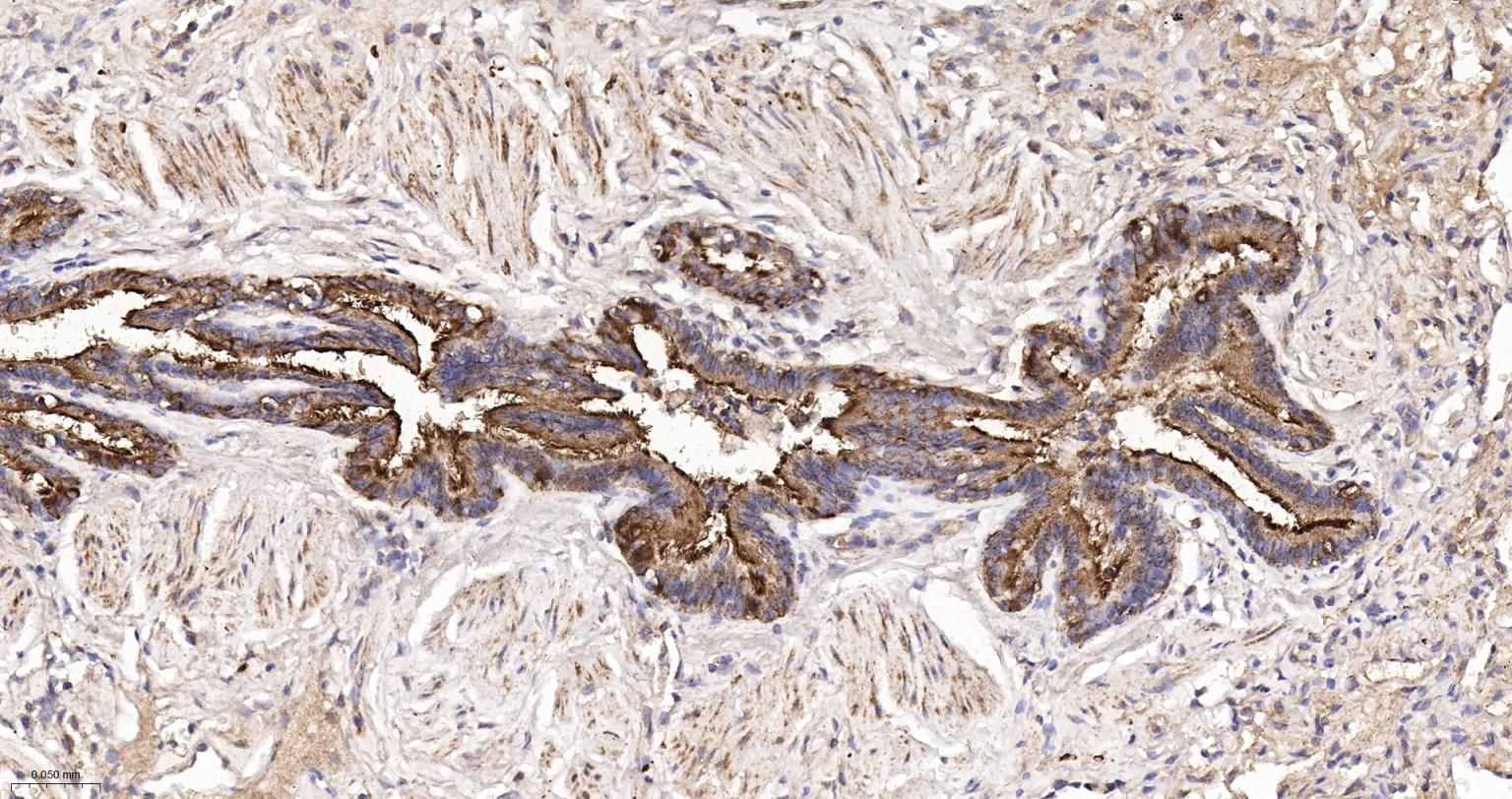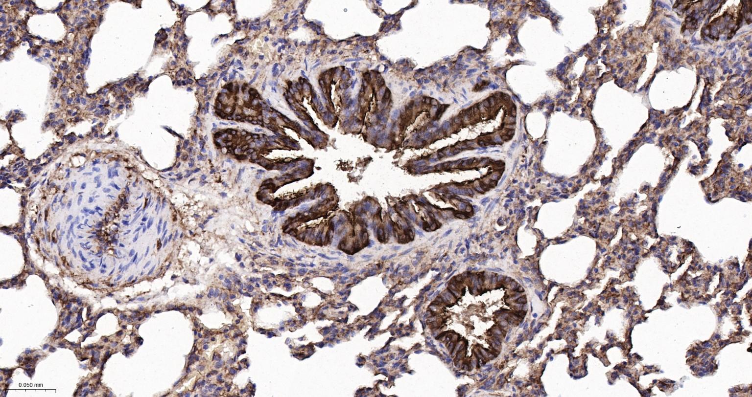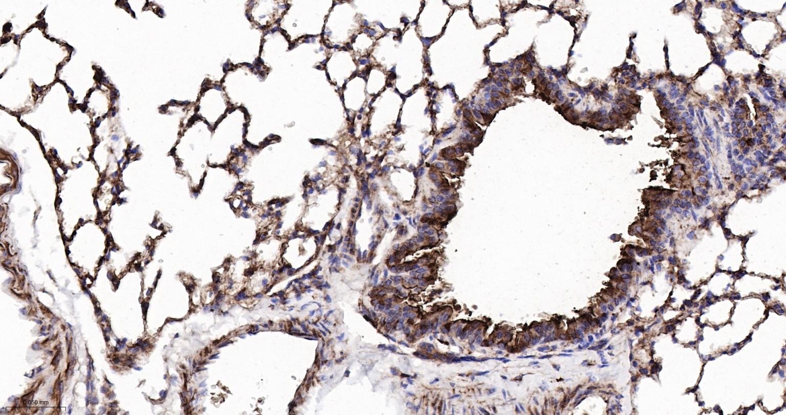 Paraformaldehyde-fixed, paraffin embedded Mouse Lung; Antigen retrieval by boiling in sodium citrate buffer (pH6.0) for 15 min; The section was incubated with SLIT2 Monoclonal Antibody, Unconjugated (bsm-61608R) at 1:200 overnight at 4°C, followed by conjugation to the bs-0295G-HRP and DAB (C-0010) staining.