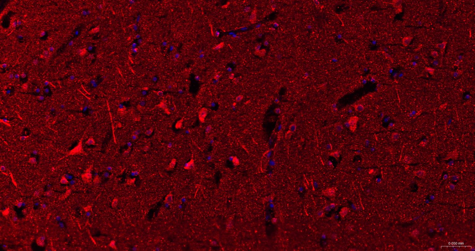 Paraformaldehyde-fixed, paraffin embedded Human Cerebrum; Antigen retrieval by boiling in sodium citrate buffer (pH6.0) for 15 min; The section was incubated with SLIT2 Monoclonal Antibody, Unconjugated (bsm-61608R) at 1:200 overnight at 4°C. Followed by conjugated Goat Anti-Ratbbit IgG antibody (Red, bs-0295G-BF594), DAPI (blue, C02-04002) was used to stain the cell nuclei.