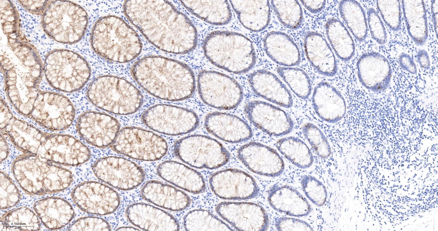 Paraformaldehyde-fixed, paraffin embedded Rat Colon; Antigen retrieval by boiling in sodium citrate buffer (pH6.0) for 15 min; The section was incubated with Galectin 4 Monoclonal Antibody, Unconjugated (bsm-61610R) at 1:200 overnight at 4°C, followed by conjugation to the bs-0295G-HRP and DAB (C-0010) staining.