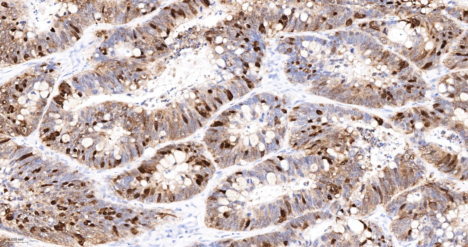 Paraformaldehyde-fixed, paraffin embedded Human Colon; Antigen retrieval by boiling in sodium citrate buffer (pH6.0) for 15 min; The section was incubated with Galectin 4 Monoclonal Antibody, Unconjugated (bsm-61610R) at 1:200 overnight at 4°C, followed by conjugation to the bs-0295G-HRP and DAB (C-0010) staining.