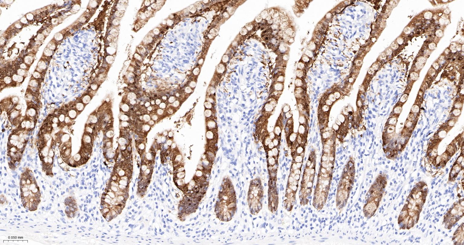 Paraformaldehyde-fixed, paraffin embedded Rat Small Intestine; Antigen retrieval by boiling in sodium citrate buffer (pH6.0) for 15 min; The section was incubated with Galectin 4 Monoclonal Antibody, Unconjugated (bsm-61610R) at 1:200 overnight at 4°C, followed by conjugation to the bs-0295G-HRP and DAB (C-0010) staining.