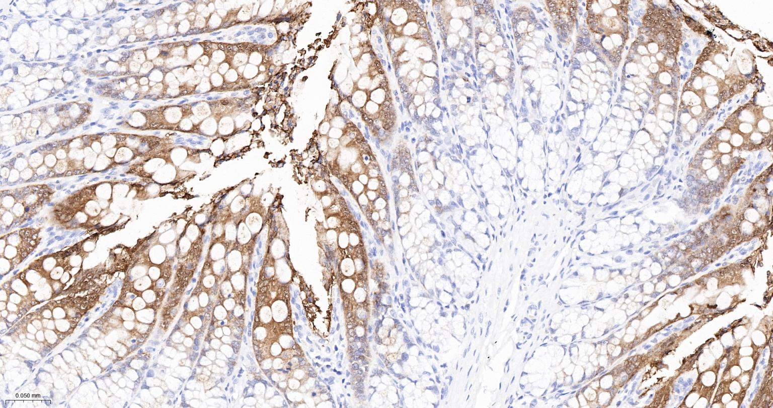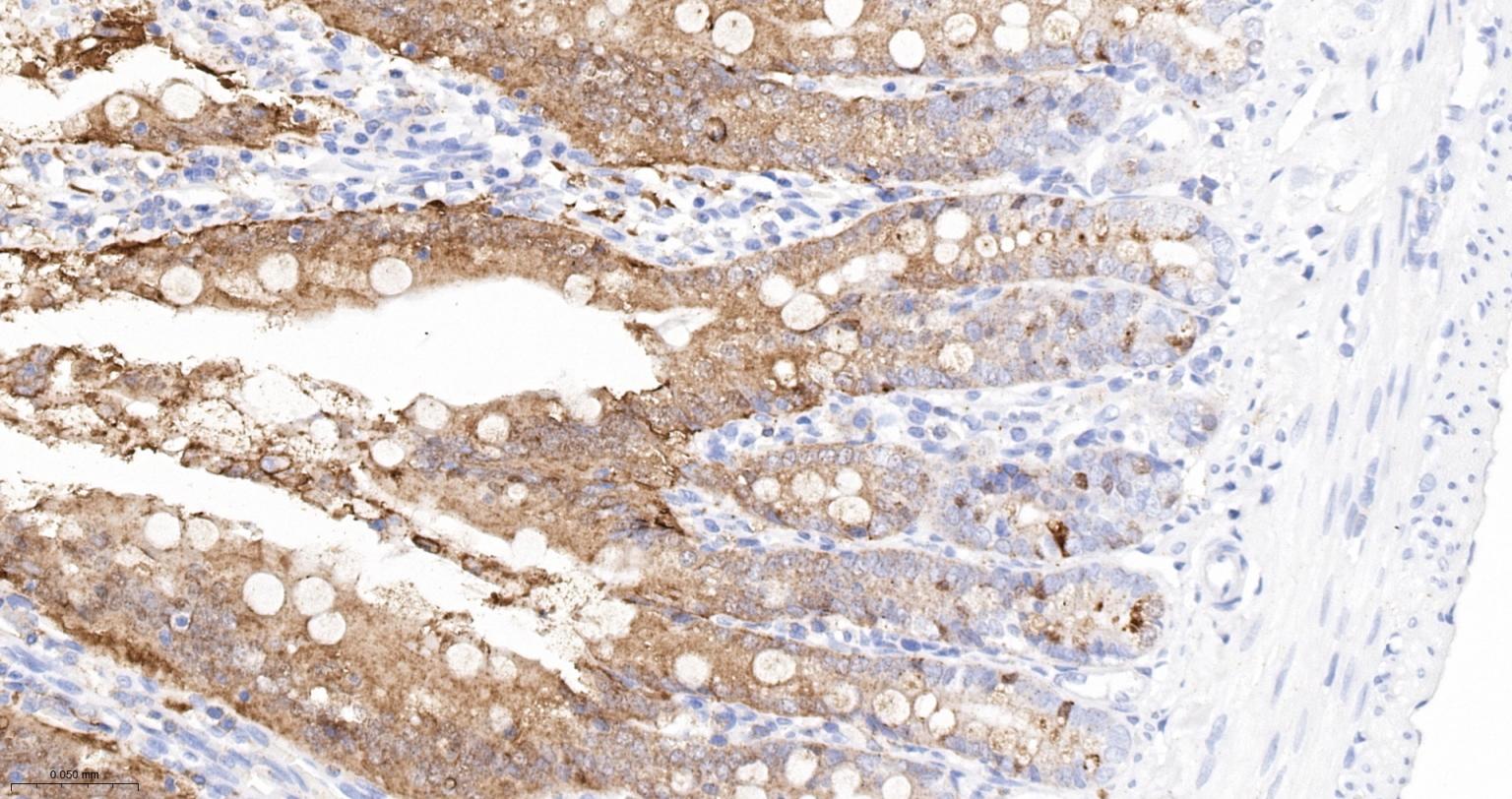 Paraformaldehyde-fixed, paraffin embedded Human Small Intestine; Antigen retrieval by boiling in sodium citrate buffer (pH6.0) for 15 min; The section was incubated with Galectin 4 Monoclonal Antibody, Unconjugated (bsm-61610R) at 1:200 overnight at 4°C, followed by conjugation to the bs-0295G-HRP and DAB (C-0010) staining.