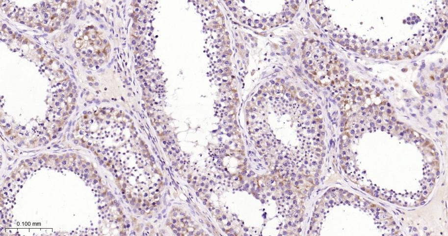 Paraformaldehyde-fixed, paraffin embedded Human Testicles; Antigen retrieval by boiling in sodium citrate buffer (pH6.0) for 15 min; Antibody incubation with ULK3 Monoclonal Antibody, Unconjugated(bsm-61618R) at 1:200 overnight at 4°C, followed by conjugation to the bs-0295G-HRP and DAB (C-0010) staining.