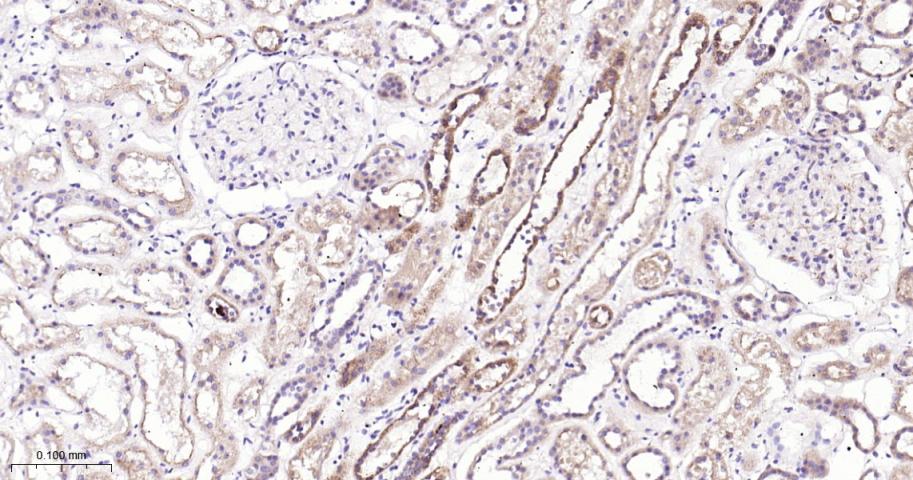 Paraformaldehyde-fixed, paraffin embedded Human Kidney; Antigen retrieval by boiling in sodium citrate buffer (pH6.0) for 15 min; Antibody incubation with ULK3 Monoclonal Antibody, Unconjugated(bsm-61618R) at 1:200 overnight at 4°C, followed by conjugation to the bs-0295G-HRP and DAB (C-0010) staining.