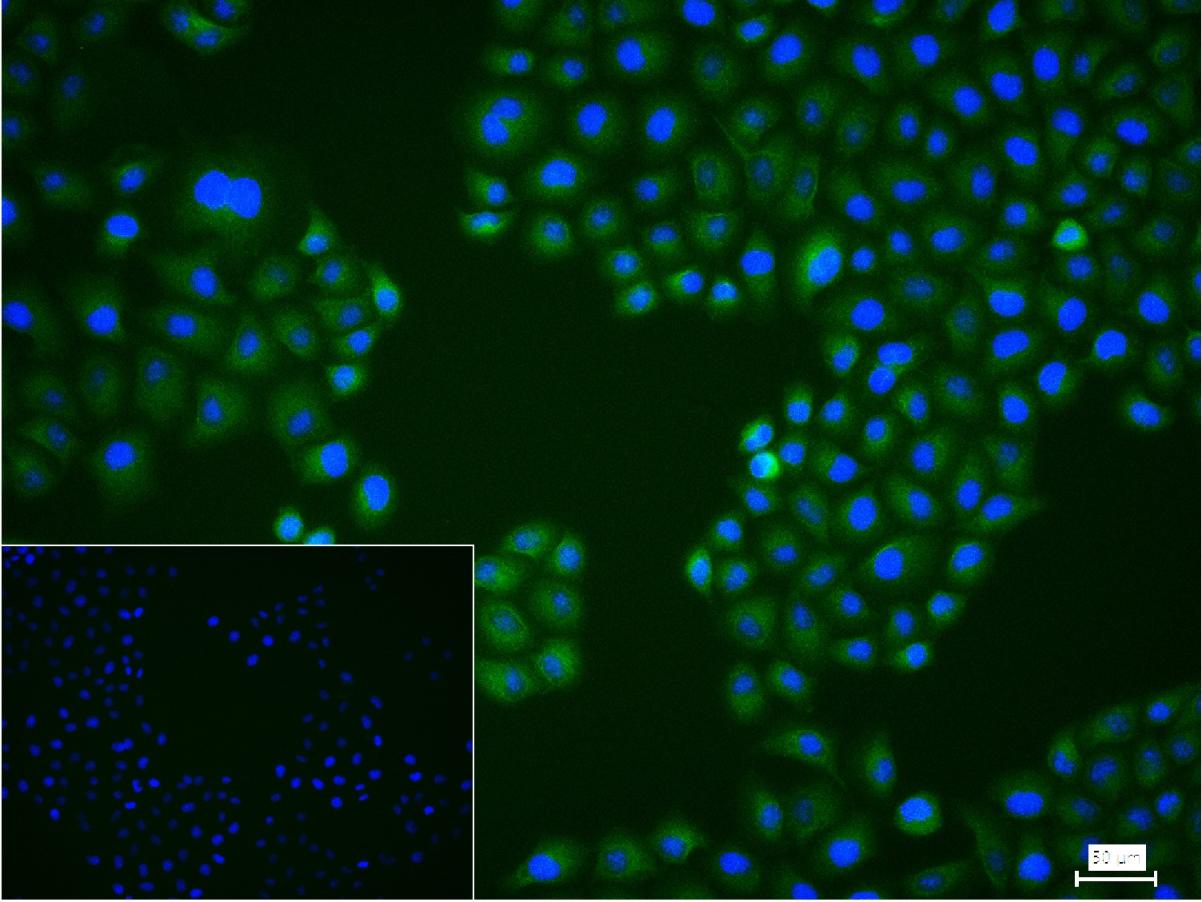 4% Paraformaldehyde-fixed Hela (H) cell; Triton X-100 at r.t. for 20 min; Antibody incubation with (ULK3) monoclonal Antibody, unconjugated (bsm-61618R) 1:100, 90 min at 37°C; followed by conjugated Goat Anti-Rabbit IgG antibody (green, bs-60295G-BF488) at 37°C for 90 min, DAPI (blue, C02-04002) was used to stain the cell nuclei. PBS instead of the primary antibody was used as the blank control.