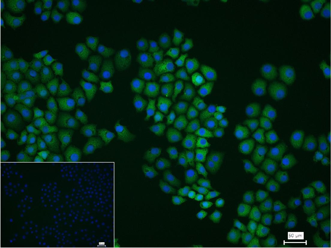4% Paraformaldehyde-fixed HepG2 (H) cell; Triton X-100 at r.t. for 20 min; Antibody incubation with (FSCN1) monoclonal Antibody, unconjugated (bsm-61626R) 1:100, 90 min at 37°C; followed by conjugated Goat Anti-Rabbit IgG antibody (green, bs-40295G-FITC) at 37°C for 90 min, DAPI (blue, C02-04002) was used to stain the cell nuclei. PBS instead of the primary antibody was used as the blank control.