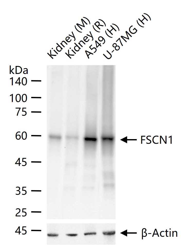 25 ug total protein per lane of various lysates (see on figure) probed with FSCN1 monoclonal antibody, unconjugated (bsm-61626R) at 1:1000 dilution and 4°C overnight incubation. Followed by conjugated secondary antibody incubation at r.t. for 60 min.