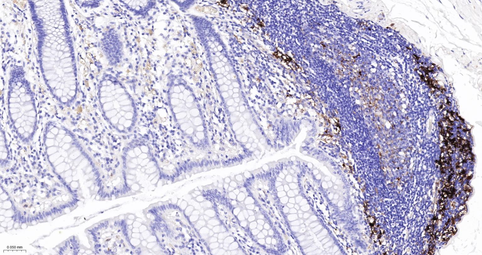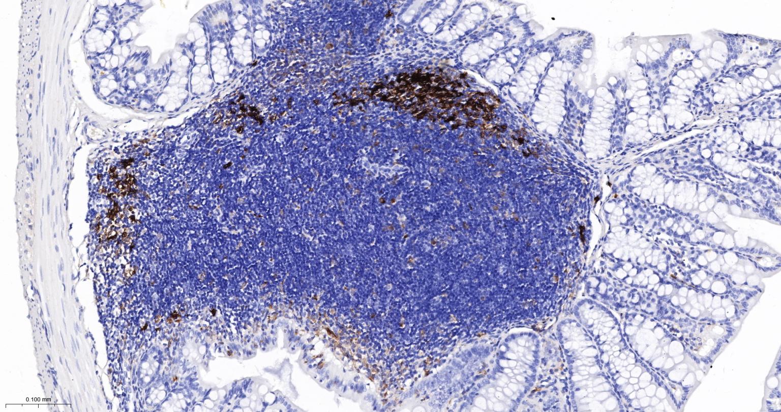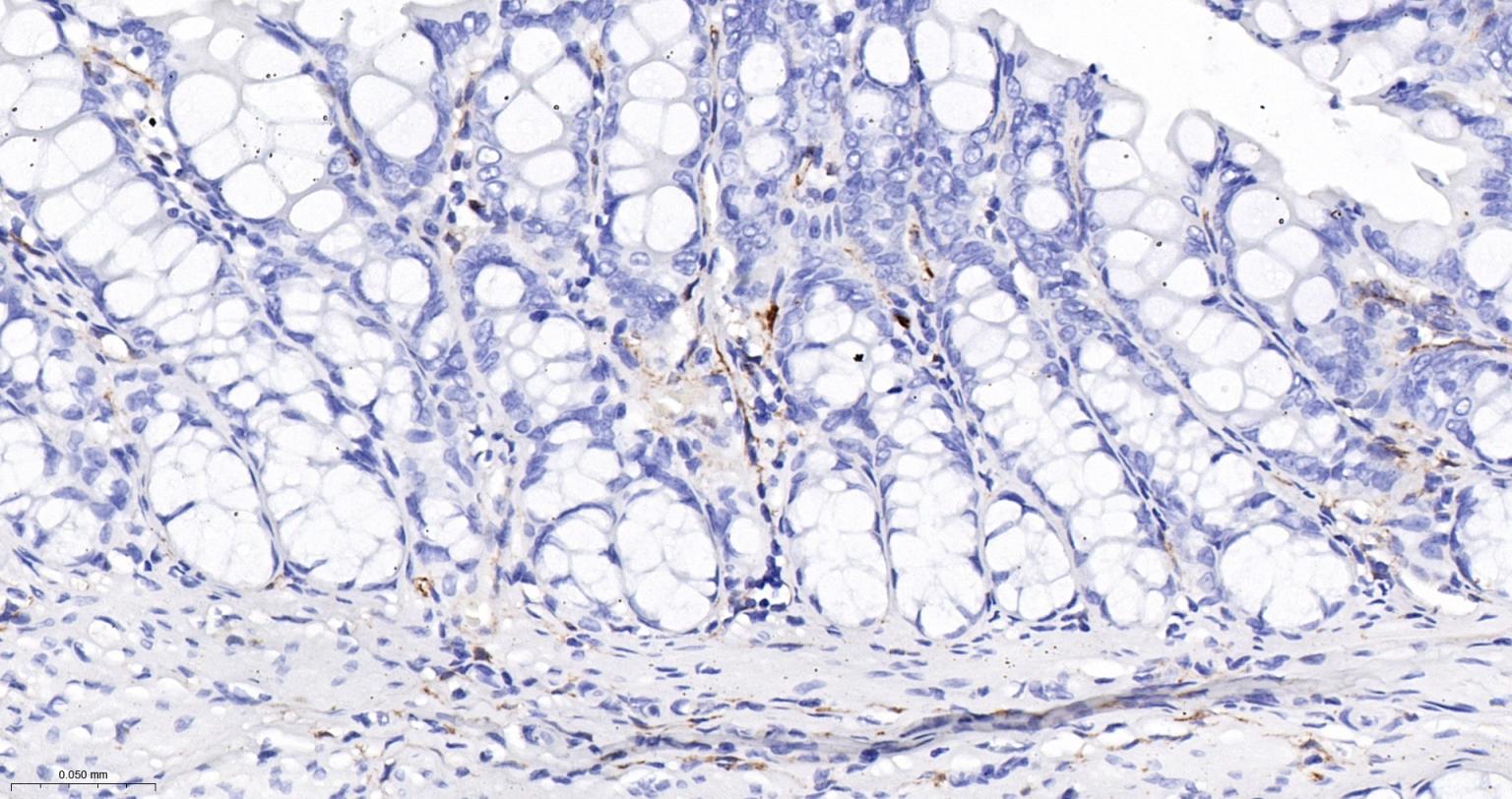 Paraformaldehyde-fixed, paraffin embedded Mouse Colon; Antigen retrieval by boiling in sodium citrate buffer (pH6.0) for 15 min; The section was incubated with FSCN1 Monoclonal Antibody, Unconjugated (bsm-61626R) at 1:200 overnight at 4°C, followed by conjugation to the bs-0295G-HRP and DAB (C-0010) staining.