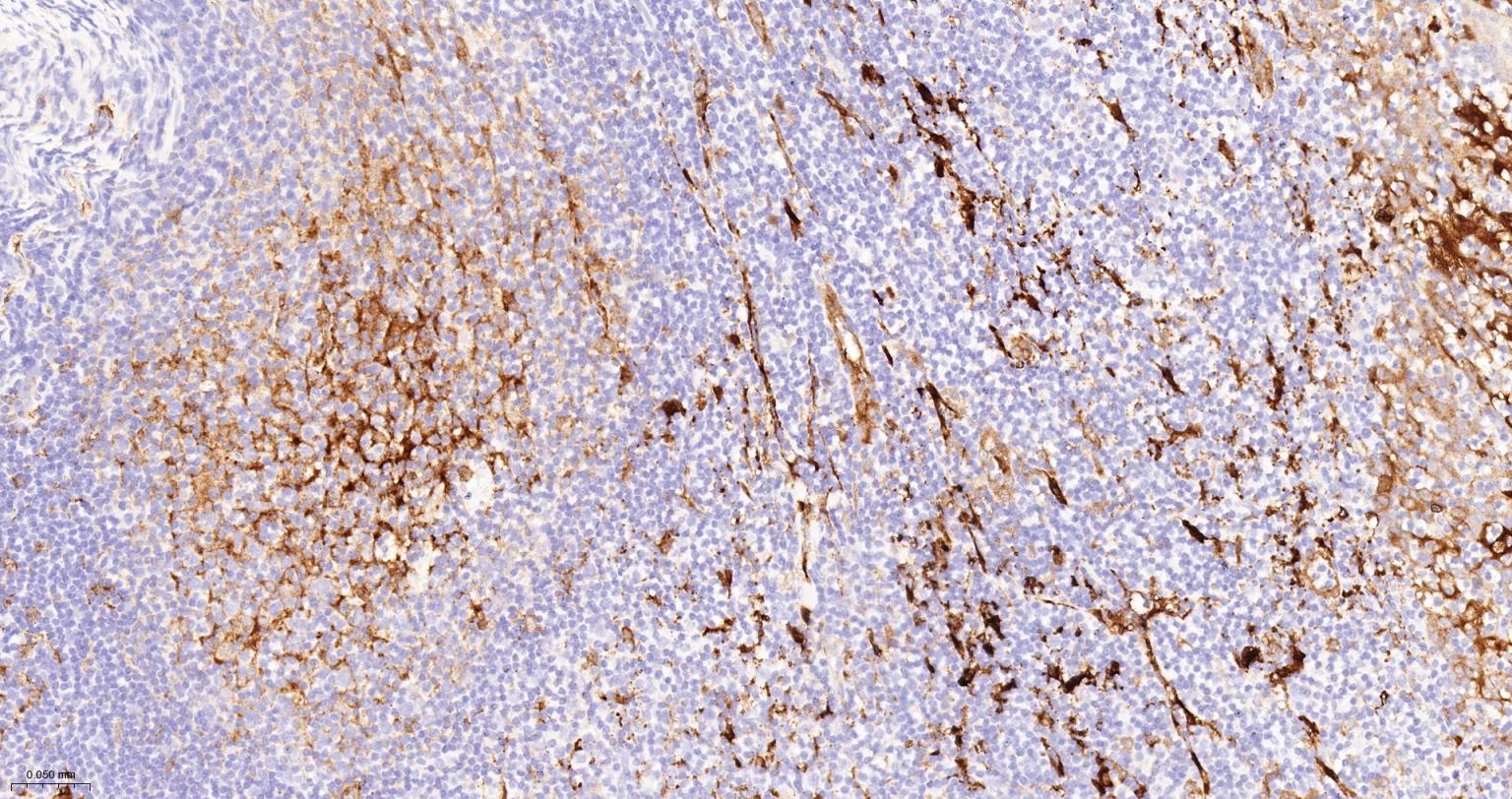 Paraformaldehyde-fixed, paraffin embedded Human Tonsil; Antigen retrieval by boiling in sodium citrate buffer (pH6.0) for 15 min; The section was incubated with FSCN1 Monoclonal Antibody, Unconjugated (bsm-61626R) at 1:200 overnight at 4°C, followed by conjugation to the bs-0295G-HRP and DAB (C-0010) staining.