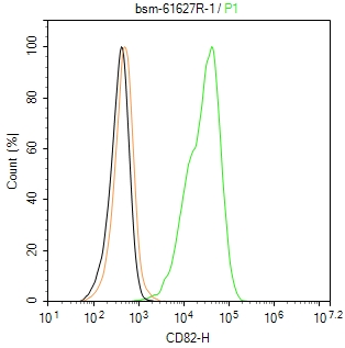 The Raji(H) cells were incubated in 5%BSA to block non-specific protein-protein interactions (30 min at r.t.) , followed by secondary antibody incubation for 40 min at room temperature. Primary Antibody (green): Rabbit Anti-CD82 antibody (bsm-61627R,1:100); Isotype Control (orange): Rabbit IgG (bs-0295P). Blank control (black): PBS. Acquisition of 20,000 events was performed.