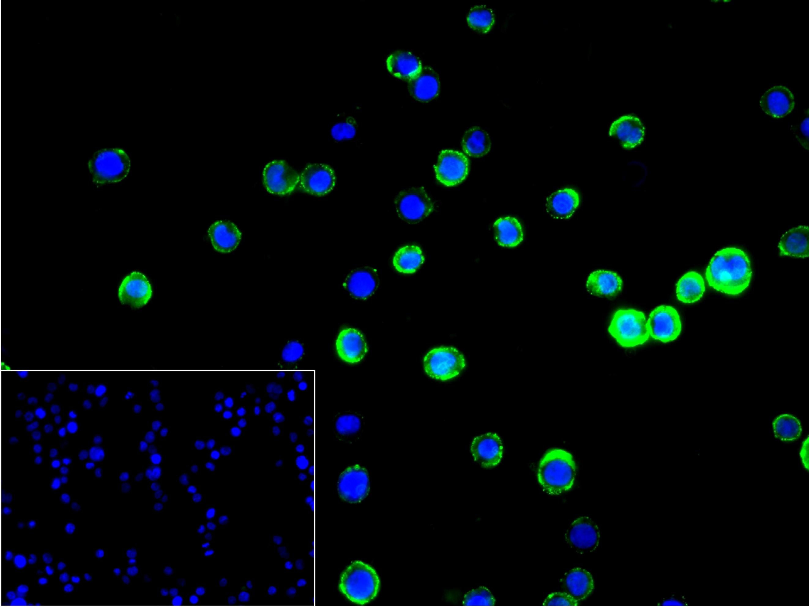 4% Paraformaldehyde-fixed Raji (H) cell; Antibody incubation with (CD82) monoclonal Antibody, unconjugated (bsm-61627R) 1:100, 90 min at 37°C; followed by conjugated Goat Anti-Rabbit IgG antibody (green, bs-60295G-BF488) at 37°C for 90 min, DAPI (blue, C02-04002) was used to stain the cell nuclei. PBS instead of the primary antibody was used as the blank control.