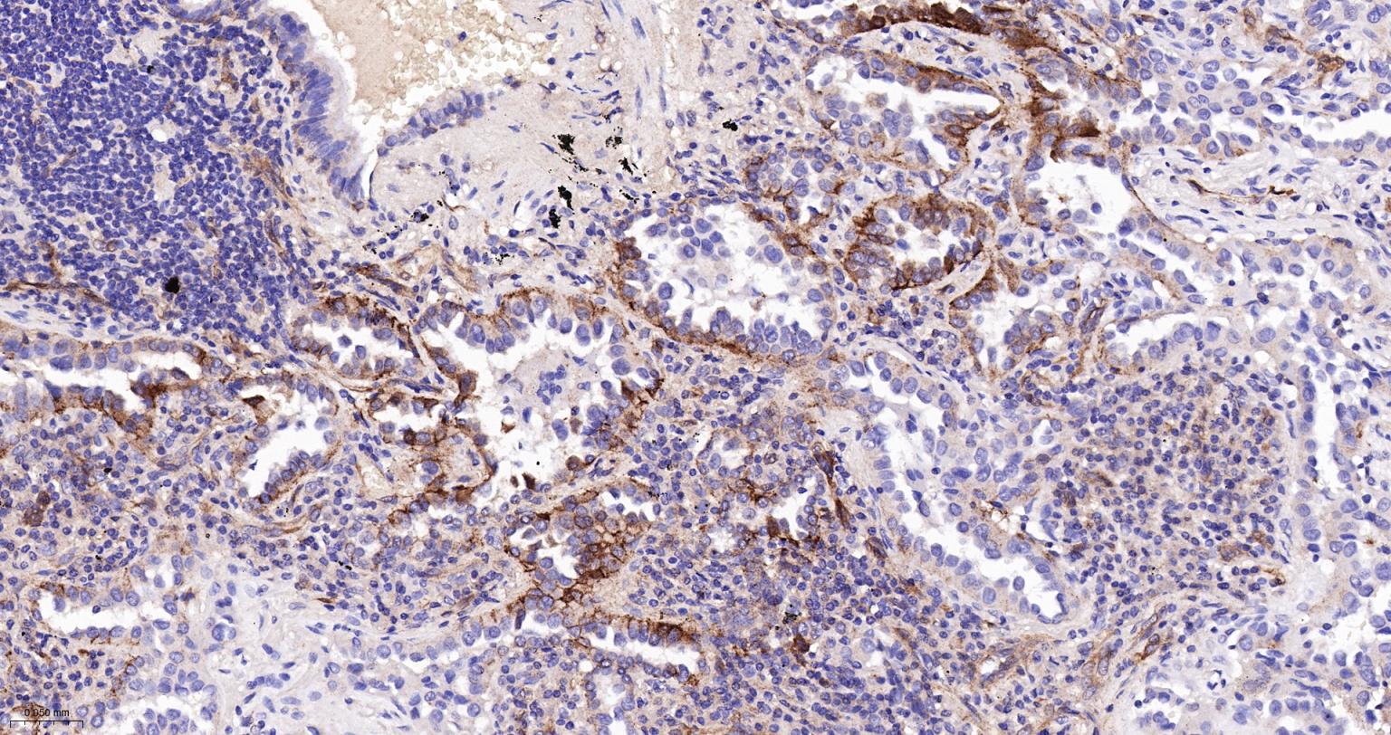 Paraformaldehyde-fixed, paraffin embedded Human Lung Cancer; Antigen retrieval by boiling in sodium citrate buffer (pH6.0) for 15 min; The section was incubated with NDRG1 Monoclonal Antibody, Unconjugated (bsm-61629R) at 1:200 overnight at 4°C, followed by conjugation to the bs-0295G-HRP and DAB (C-0010) staining.