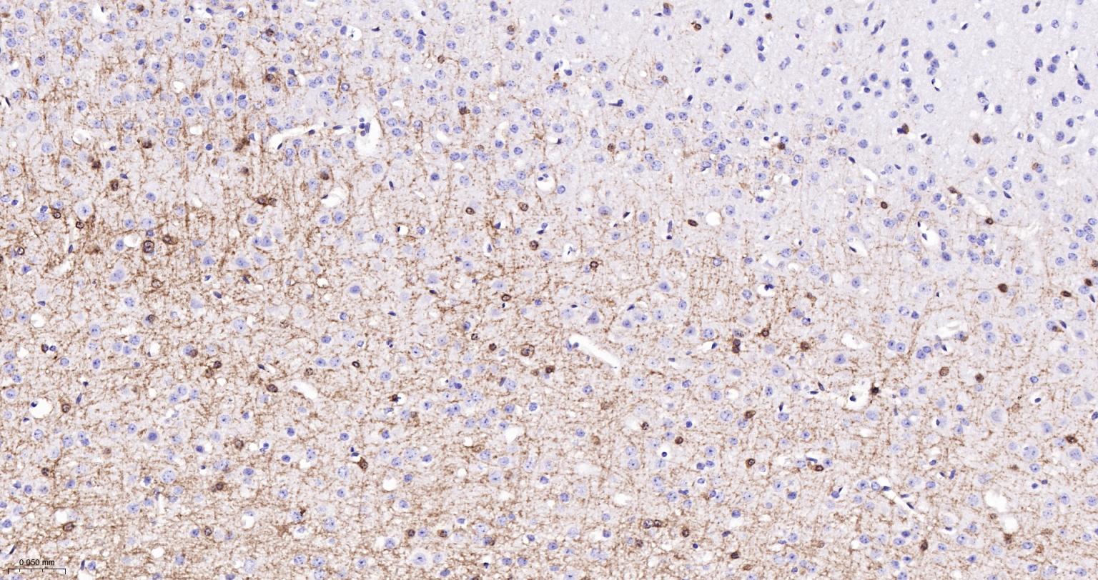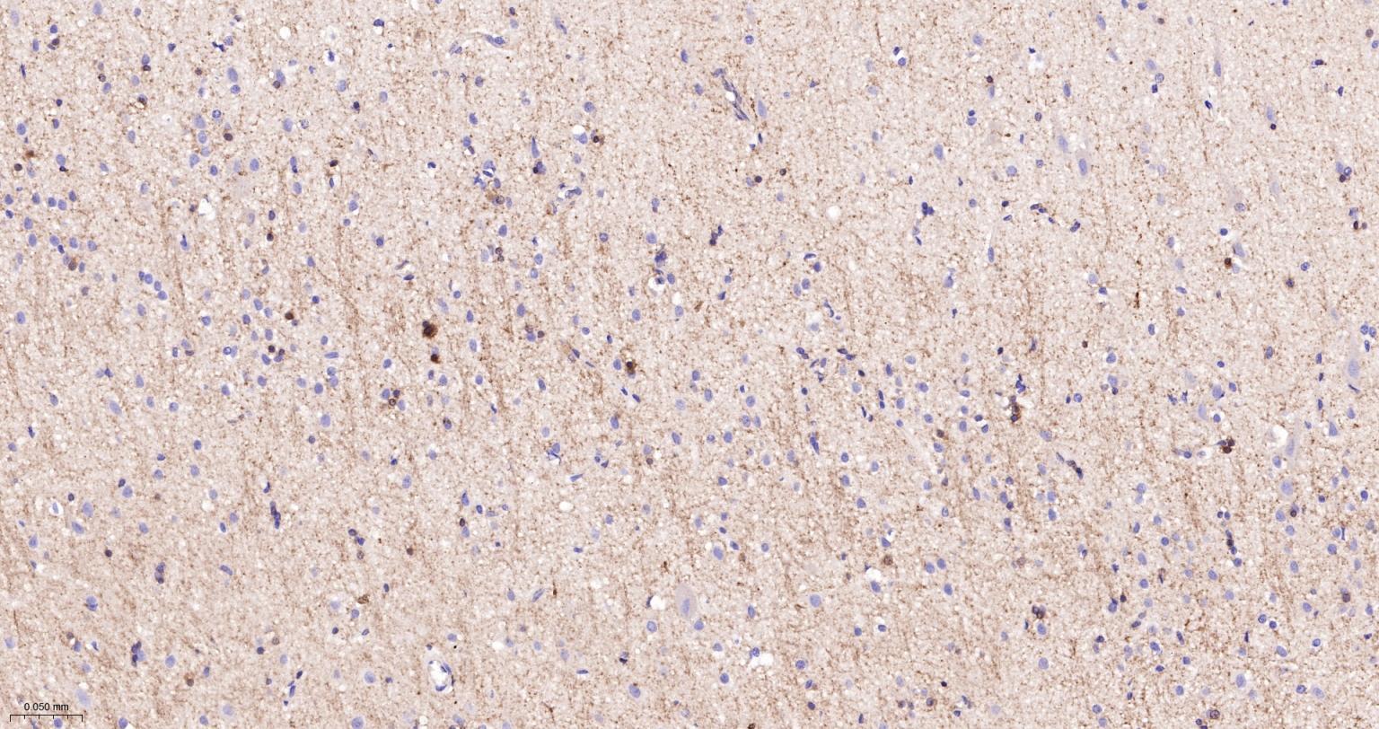 Paraformaldehyde-fixed, paraffin embedded Human Cerebrum; Antigen retrieval by boiling in sodium citrate buffer (pH6.0) for 15 min; The section was incubated with NDRG1 Monoclonal Antibody, Unconjugated (bsm-61629R) at 1:200 overnight at 4°C, followed by conjugation to the bs-0295G-HRP and DAB (C-0010) staining.