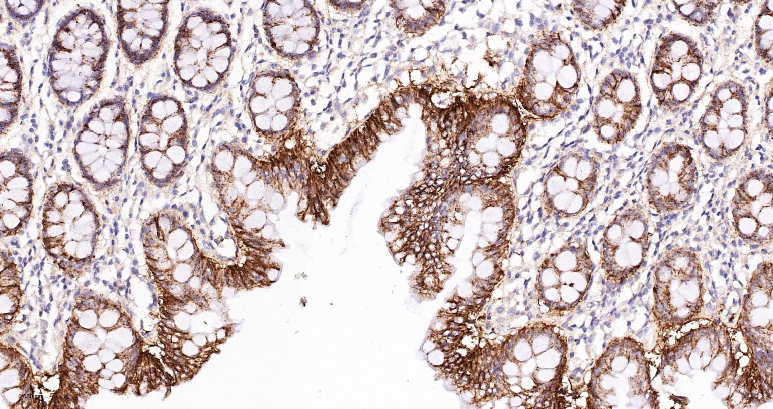 Paraformaldehyde-fixed, paraffin embedded Human Colon; Antigen retrieval by boiling in sodium citrate buffer (pH6.0) for 15 min; The section was incubated with NDRG1 Monoclonal Antibody, Unconjugated (bsm-61629R) at 1:200 overnight at 4°C, followed by conjugation to the bs-0295G-HRP and DAB (C-0010) staining.