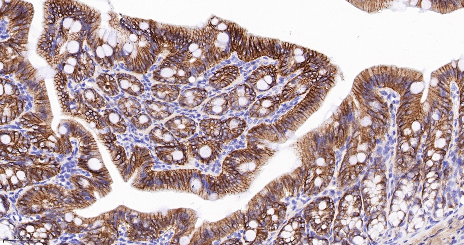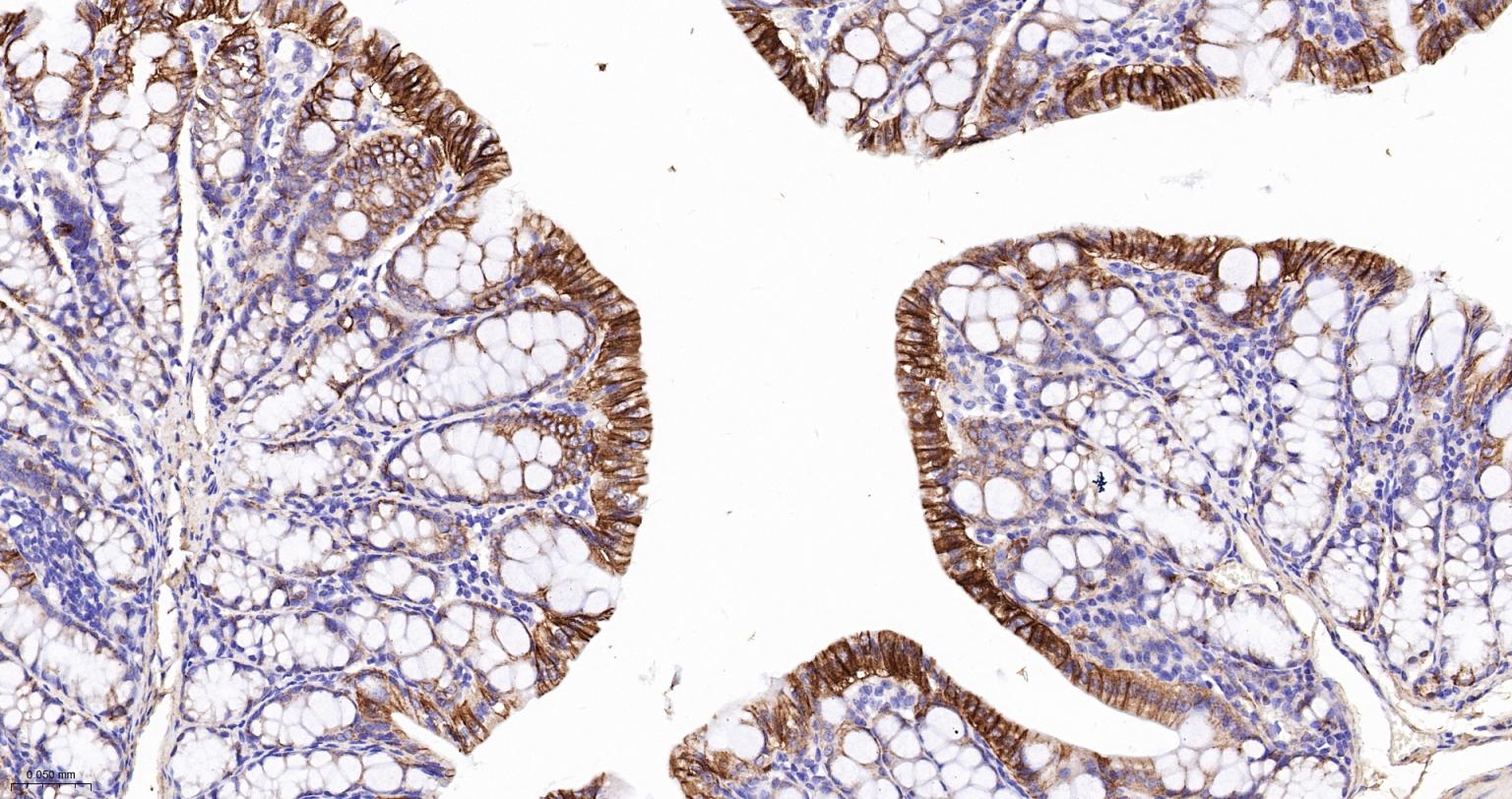 Paraformaldehyde-fixed, paraffin embedded Mouse Colon; Antigen retrieval by boiling in sodium citrate buffer (pH6.0) for 15 min; The section was incubated with NDRG1 Monoclonal Antibody, Unconjugated (bsm-61629R) at 1:200 overnight at 4°C, followed by conjugation to the bs-0295G-HRP and DAB (C-0010) staining.