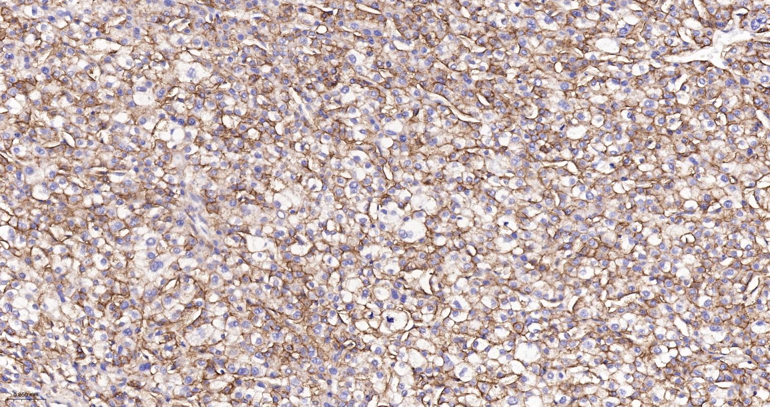 Paraformaldehyde-fixed, paraffin embedded Human Liver Cancer; Antigen retrieval by boiling in sodium citrate buffer (pH6.0) for 15 min; The section was incubated with NDRG1 Monoclonal Antibody, Unconjugated (bsm-61629R) at 1:200 overnight at 4°C, followed by conjugation to the bs-0295G-HRP and DAB (C-0010) staining.