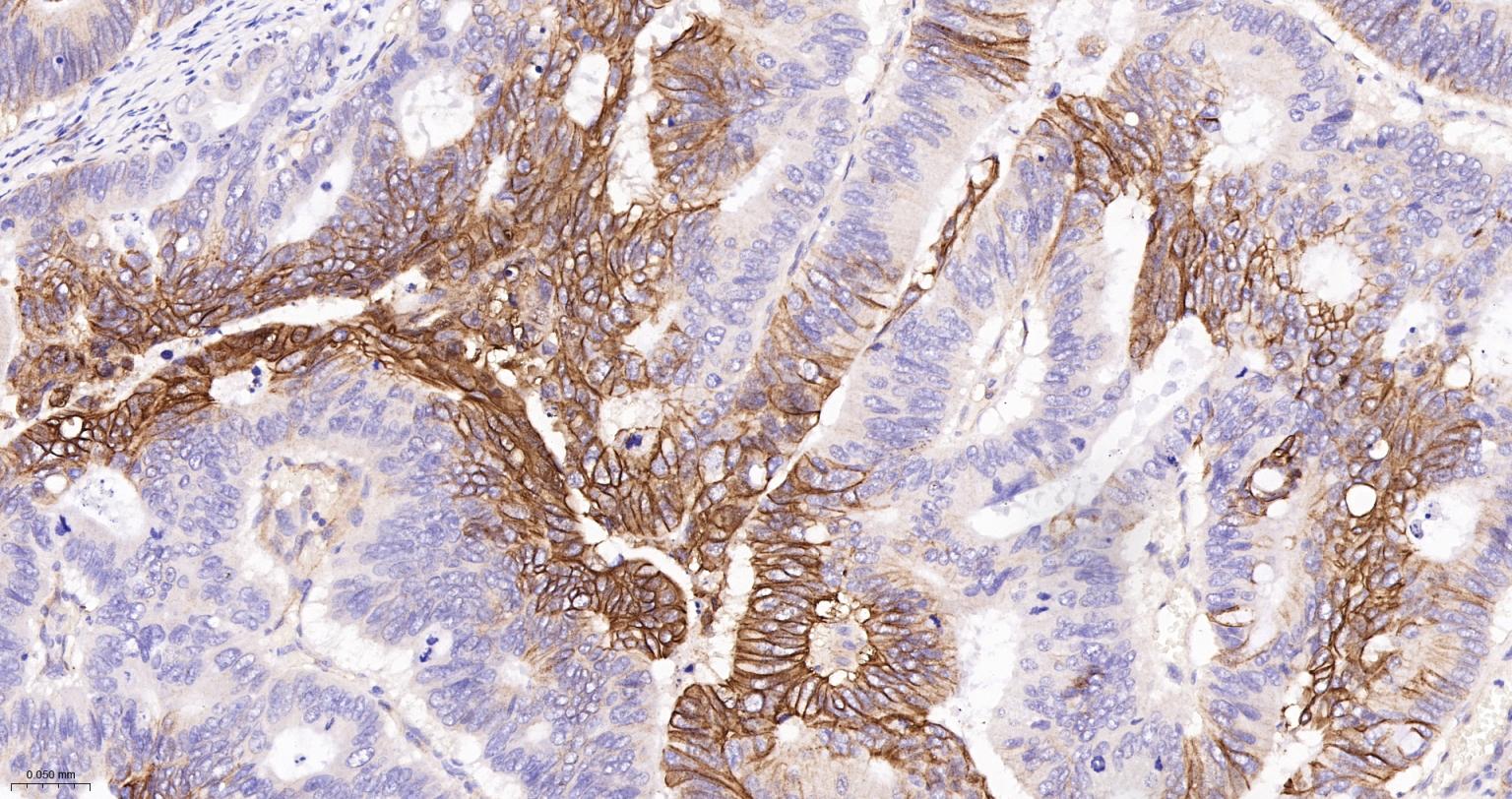Paraformaldehyde-fixed, paraffin embedded Human Colon Cancer; Antigen retrieval by boiling in sodium citrate buffer (pH6.0) for 15 min; The section was incubated with NDRG1 Monoclonal Antibody, Unconjugated (bsm-61629R) at 1:200 overnight at 4°C, followed by conjugation to the bs-0295G-HRP and DAB (C-0010) staining.