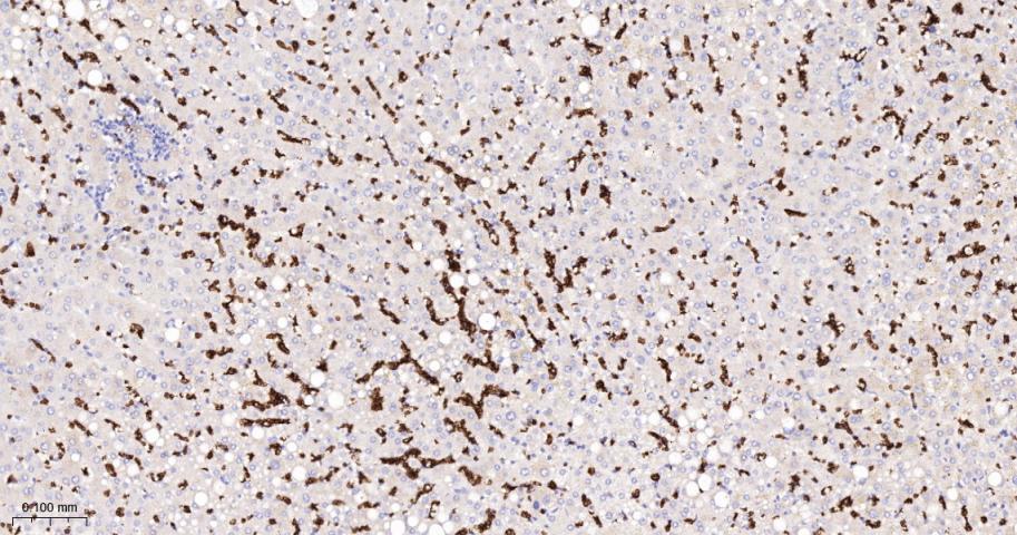 Paraformaldehyde-fixed, paraffin embedded Human Liver; Antigen retrieval by boiling in sodium citrate buffer (pH6.0) for 15 min; The section was incubated with Glycophorin A Monoclonal Antibody, Unconjugated (bsm-61632R) at 1:200 overnight at 4°C, followed by conjugation to the bs-0295G-HRP and DAB (C-0010) staining.