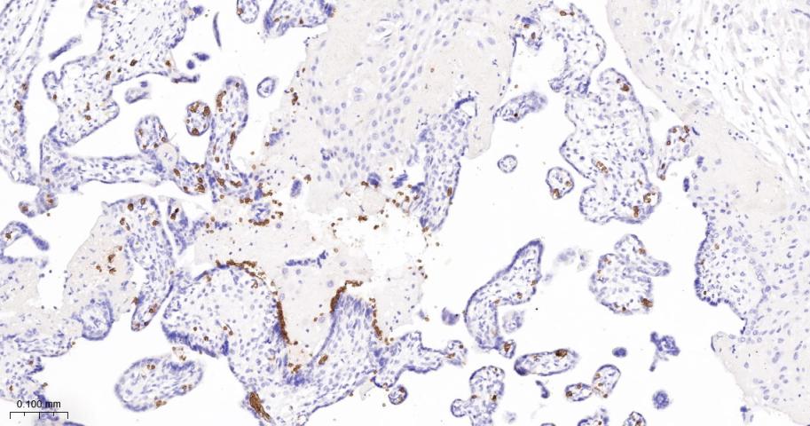 Paraformaldehyde-fixed, paraffin embedded Human Placenta; Antigen retrieval by boiling in sodium citrate buffer (pH6.0) for 15 min; The section was incubated with Glycophorin A Monoclonal Antibody, Unconjugated (bsm-61632R) at 1:200 overnight at 4°C, followed by conjugation to the bs-0295G-HRP and DAB (C-0010) staining.