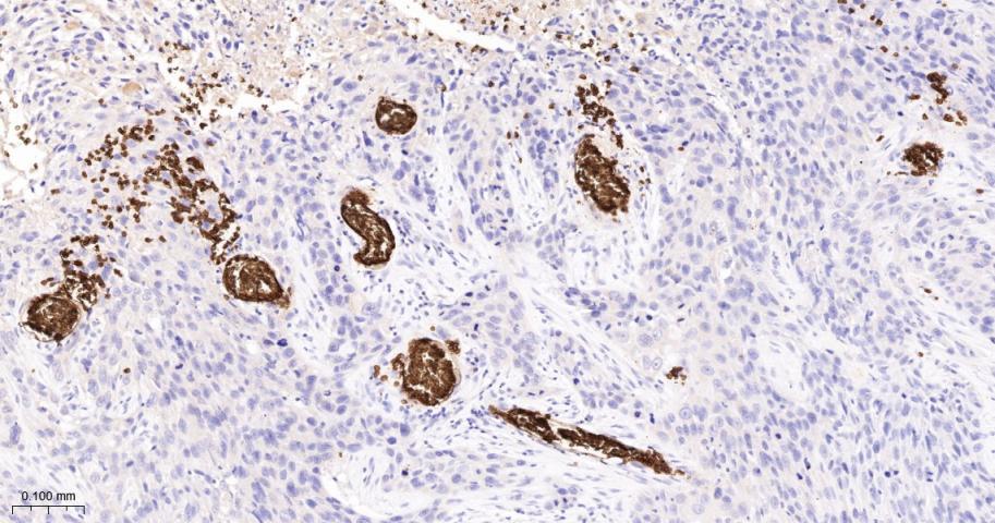 Paraformaldehyde-fixed, paraffin embedded Human Esophageal Cancer; Antigen retrieval by boiling in sodium citrate buffer (pH6.0) for 15 min; The section was incubated with Glycophorin A Monoclonal Antibody, Unconjugated (bsm-61632R) at 1:200 overnight at 4°C, followed by conjugation to the bs-0295G-HRP and DAB (C-0010) staining.