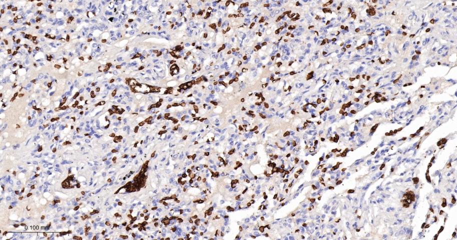 Paraformaldehyde-fixed, paraffin embedded Human Spleen; Antigen retrieval by boiling in sodium citrate buffer (pH6.0) for 15 min; The section was incubated with Glycophorin A Monoclonal Antibody, Unconjugated (bsm-61632R) at 1:200 overnight at 4°C, followed by conjugation to the bs-0295G-HRP and DAB (C-0010) staining.
