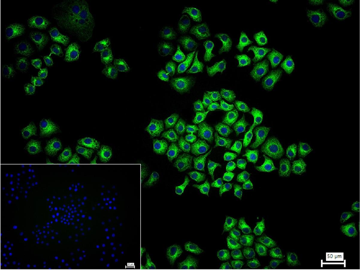 4% Paraformaldehyde-fixed HepG2 (H) cell; Triton X-100 at r.t. for 20 min; Antibody incubation with (CYP2D6) monoclonal Antibody, unconjugated (bsm-61641R) 1:100, 90 min at 37°C; followed by conjugated Goat Anti-Rabbit IgG antibody (green, bs-40295G-FITC) at 37°C for 90 min, DAPI (blue, C02-04002) was used to stain the cell nuclei. PBS instead of the primary antibody was used as the blank control.