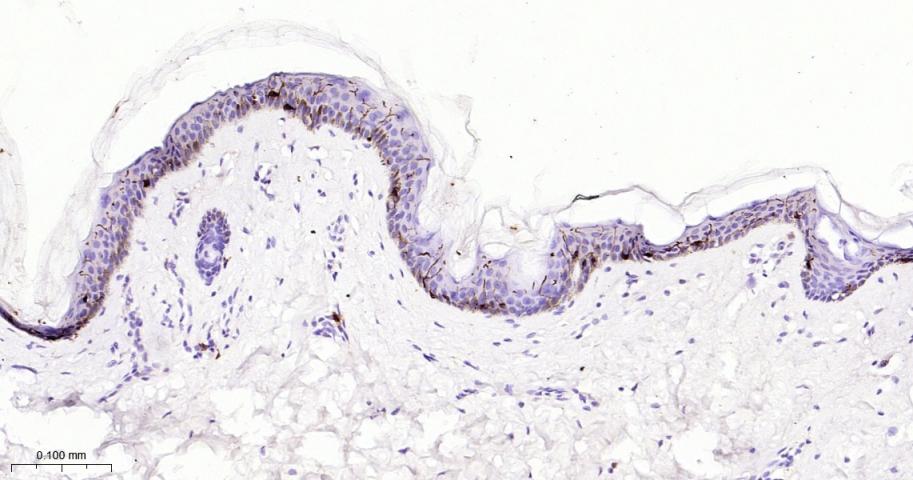 Paraformaldehyde-fixed, paraffin embedded Human SKin; Antigen retrieval by boiling in sodium citrate buffer (pH6.0) for 15 min; Antibody incubation with CD207 Monoclonal Antibody, Unconjugated(bsm-61646R) at 1:200 overnight at 4°C, followed by conjugation to the bs-0295G-HRP and DAB (C-0010) staining.