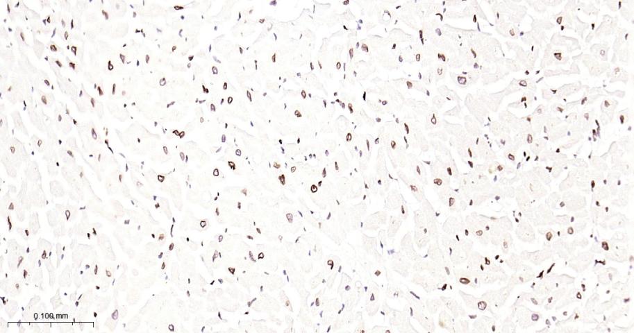 Paraformaldehyde-fixed, paraffin embedded Human Heart; Antigen retrieval by boiling in sodium citrate buffer (pH6.0) for 15 min; Antibody incubation with Lamin B2 Monoclonal Antibody, Unconjugated(bsm-61648R) at 1:200 overnight at 4°C, followed by conjugation to the bs-0295G-HRP and DAB (C-0010) staining.