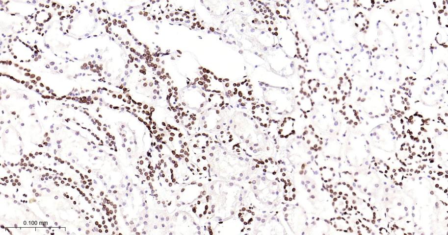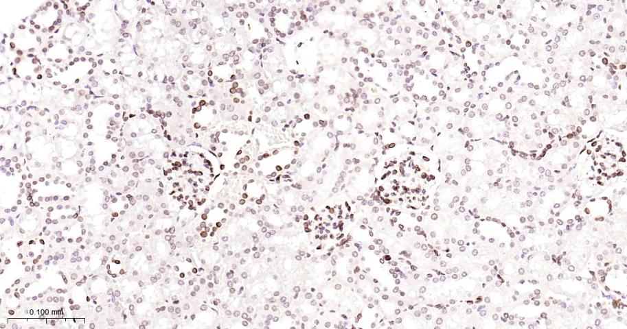 Paraformaldehyde-fixed, paraffin embedded Mouse Kidney; Antigen retrieval by boiling in sodium citrate buffer (pH6.0) for 15 min; Antibody incubation with Lamin B2 Monoclonal Antibody, Unconjugated(bsm-61648R) at 1:200 overnight at 4°C, followed by conjugation to the bs-0295G-HRP and DAB (C-0010) staining.