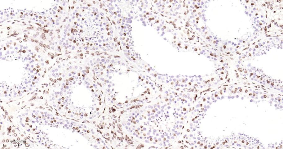 Paraformaldehyde-fixed, paraffin embedded Human Testicles; Antigen retrieval by boiling in sodium citrate buffer (pH6.0) for 15 min; Antibody incubation with Lamin B2 Monoclonal Antibody, Unconjugated(bsm-61648R) at 1:200 overnight at 4°C, followed by conjugation to the bs-0295G-HRP and DAB (C-0010) staining.