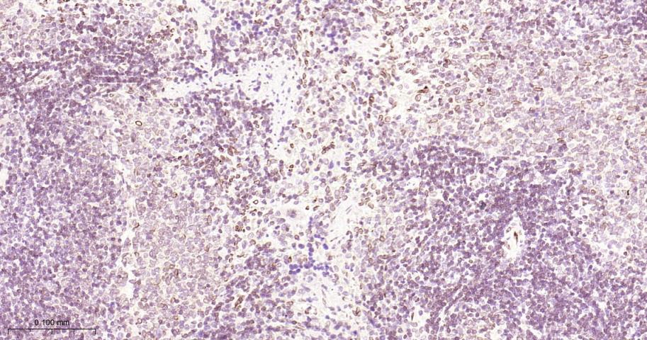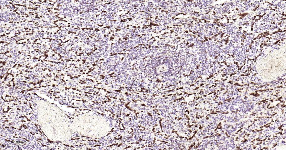 Paraformaldehyde-fixed, paraffin embedded Human Spleen; Antigen retrieval by boiling in sodium citrate buffer (pH6.0) for 15 min; Antibody incubation with Lamin B2 Monoclonal Antibody, Unconjugated(bsm-61648R) at 1:200 overnight at 4°C, followed by conjugation to the bs-0295G-HRP and DAB (C-0010) staining.
