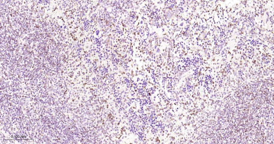 Paraformaldehyde-fixed, paraffin embedded Rat Spleen; Antigen retrieval by boiling in sodium citrate buffer (pH6.0) for 15 min; Antibody incubation with Lamin B2 Monoclonal Antibody, Unconjugated(bsm-61648R) at 1:200 overnight at 4°C, followed by conjugation to the bs-0295G-HRP and DAB (C-0010) staining.