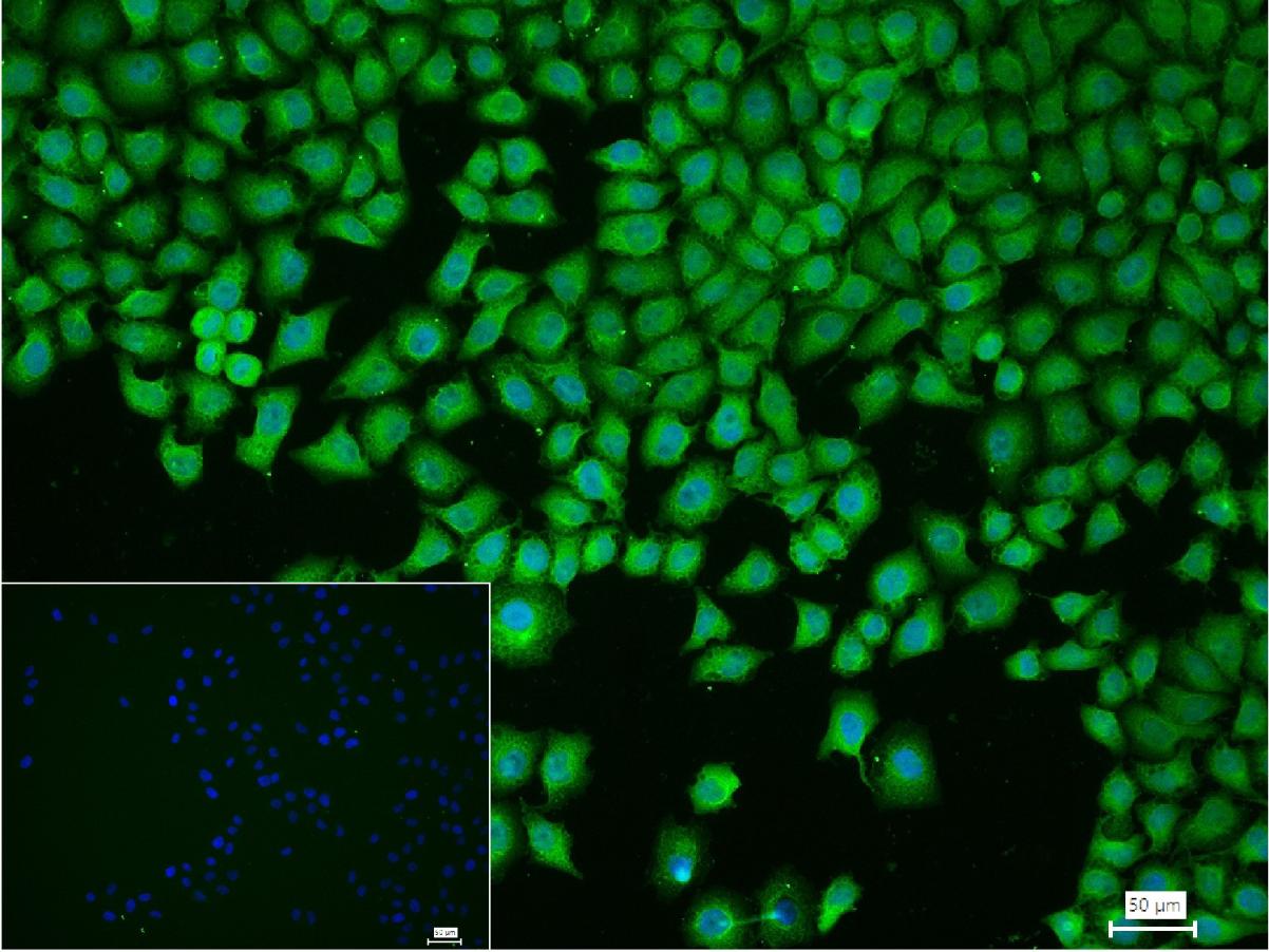 4% Paraformaldehyde-fixed Hela (H) cell; Triton X-100 at r.t. for 20 min; Antibody incubation with (EEF2) monoclonal Antibody, unconjugated (bsm-61650R) 1:100, 90 min at 37°C; followed by conjugated Goat Anti-Rabbit IgG antibody (green, bs-40295G-FITC) at 37°C for 90 min, DAPI (blue, C02-04002) was used to stain the cell nuclei. PBS instead of the primary antibody was used as the blank control.