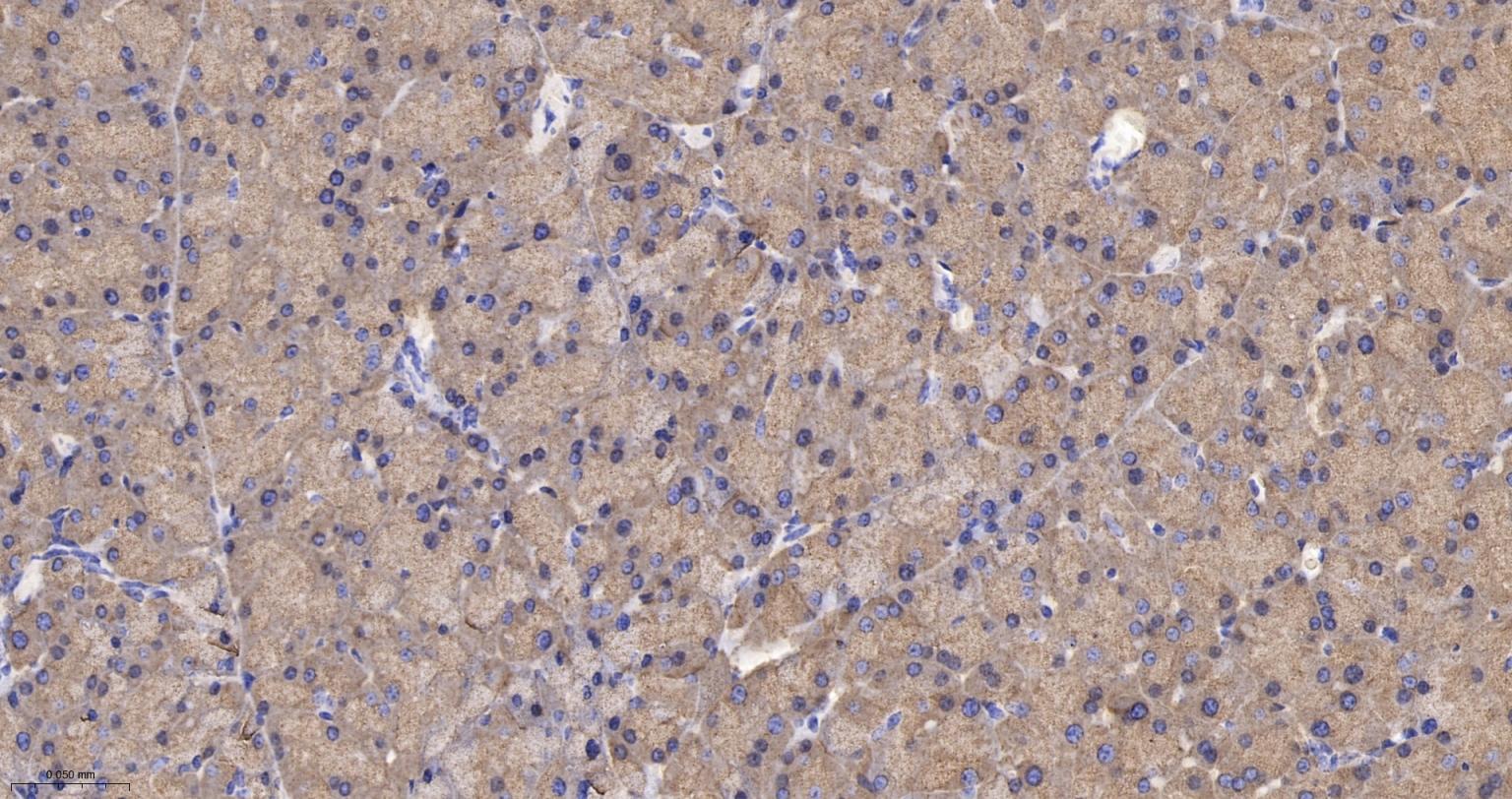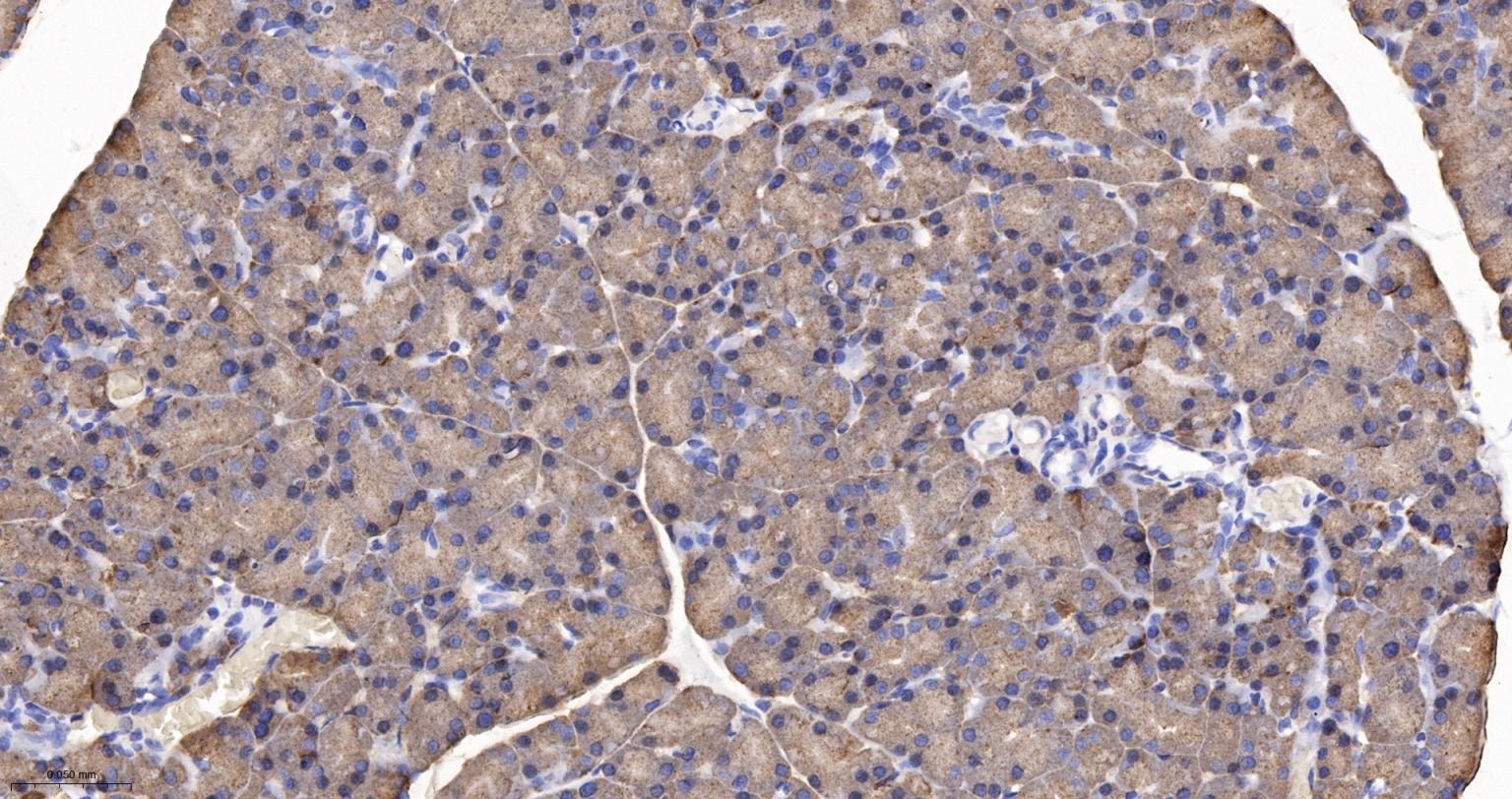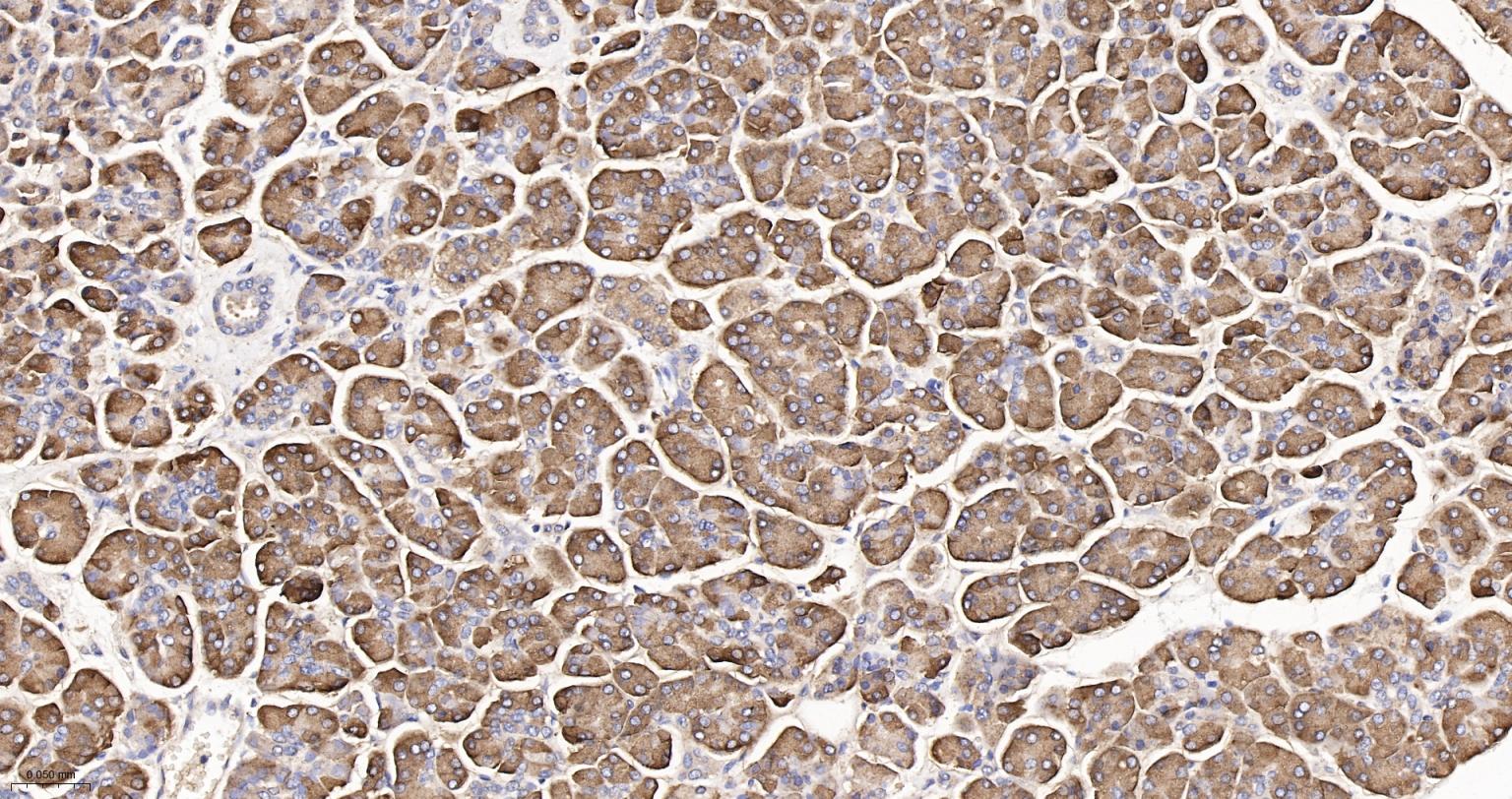 Paraformaldehyde-fixed, paraffin embedded Rat Pancreas; Antigen retrieval by boiling in sodium citrate buffer (pH6.0) for 15 min; The section was incubated with EEF2 Monoclonal Antibody, Unconjugated (bsm-61650R) at 1:200 overnight at 4°C, followed by conjugation to the bs-0295G-HRP and DAB (C-0010) staining.