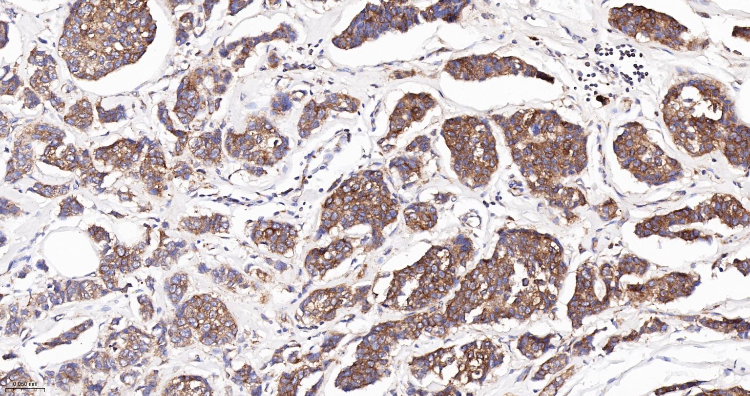 Paraformaldehyde-fixed, paraffin embedded Human Breast Cancer; Antigen retrieval by boiling in sodium citrate buffer (pH6.0) for 15 min; The section was incubated with EEF2 Monoclonal Antibody, Unconjugated (bsm-61650R) at 1:200 overnight at 4°C, followed by conjugation to the bs-0295G-HRP and DAB (C-0010) staining.